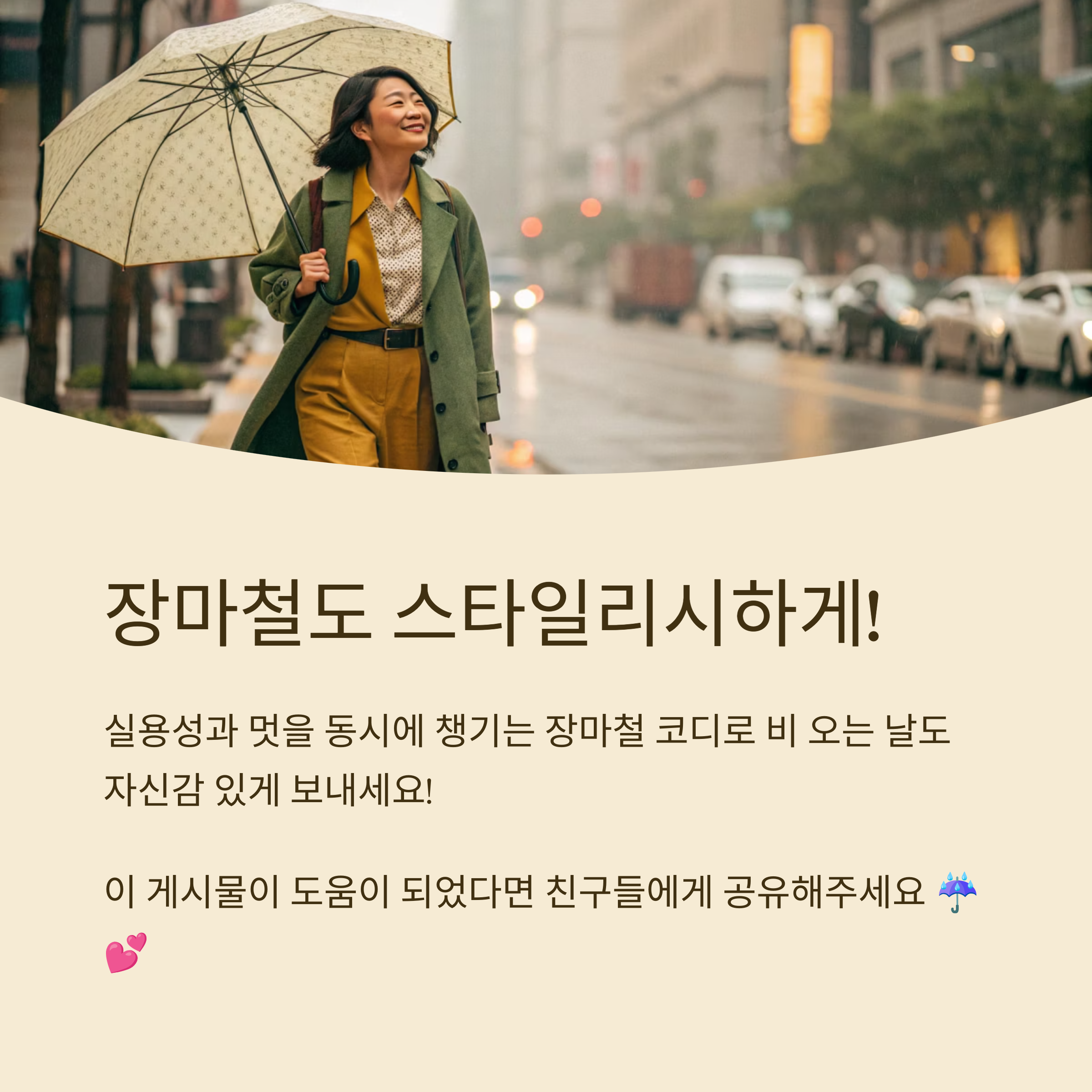 작은 소품 하나가 전체 룩을 업그레이드해줘요. 실용성만 생각하던 장마철 가방과 우산도 이제는 내 코디의 일부로, 트렌디하게 활용해보는 건 어때요? ☺️