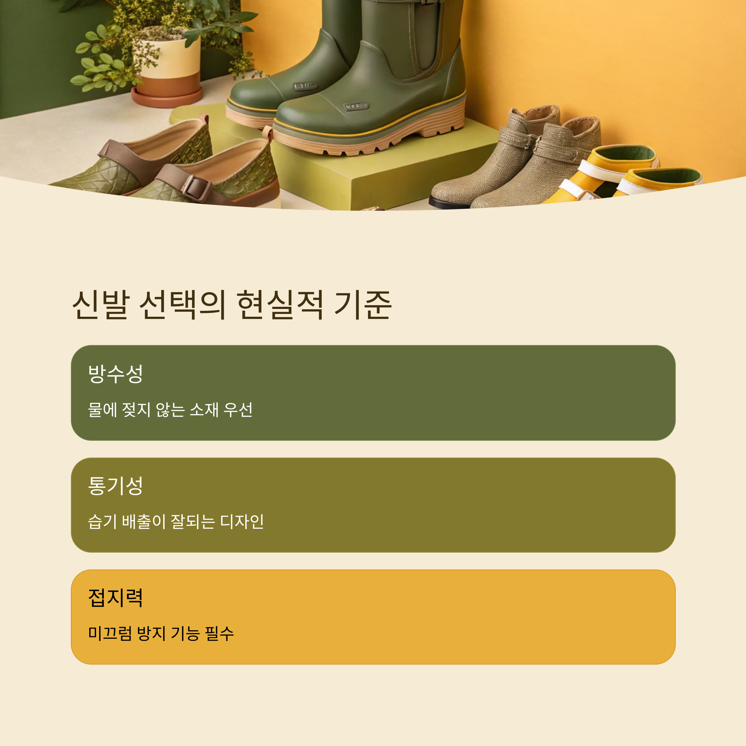 비 오는 날 신발 고르기, 정말 까다롭죠? 스니커즈 신었다가 젖으면 하루 종일 축축하고, 슬리퍼 신으면 미끄러지고… 신발 선택은 그날의 모든 기분을 좌우한다고 해도 과언이 아니에요. 그래서 장마철 신발은 ‘방수, 통기성, 접지력’ 이 세 가지가 핵심 포인트예요.
