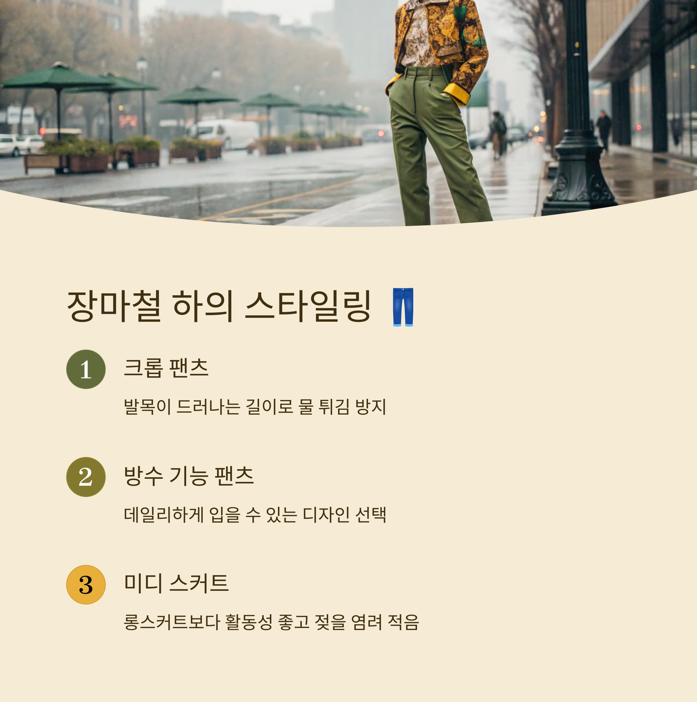 비 오는 날엔 바지도 전략적으로 골라야 해요. 청바지처럼 두껍고 마르기 힘든 소재는 피하고, 나일론이나 폴리 혼방 제품을 선택하면 좋답니다. 특히 와이드 팬츠보다는 발목이 드러나는 크롭 팬츠나 조거 팬츠가 실용적이에요.