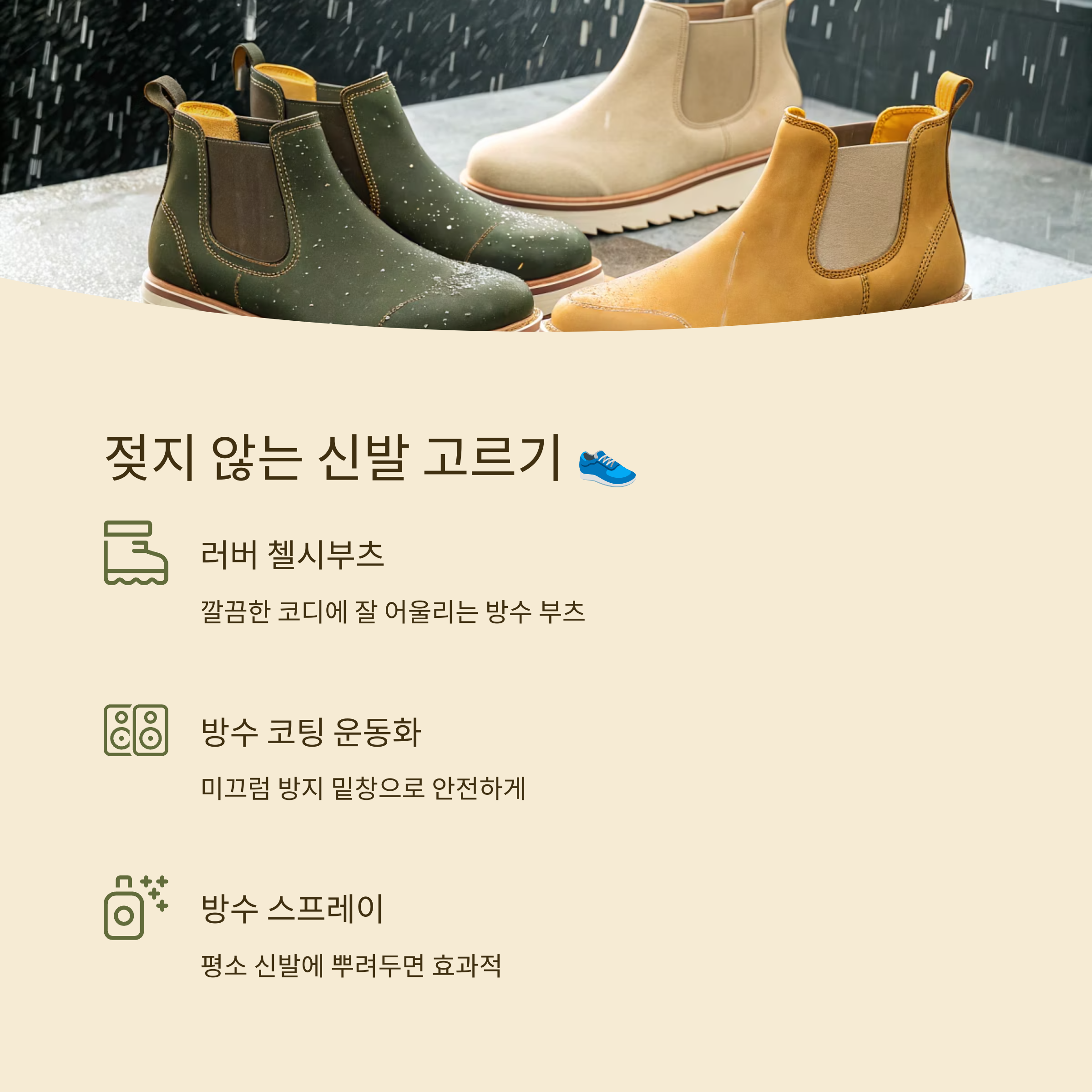 러버 소재의 첼시 부츠는 깔끔한 코디에 잘 어울리고, 슬립온 타입의 방수 슈즈는 출퇴근용으로도 좋아요. 무엇보다 바닥 미끄럼 방지 처리가 잘 되어 있어야 장마철 안전하게 걸을 수 있어요. 젖은 보도블록이나 계단에서 미끄러지는 일 정말 많거든요!