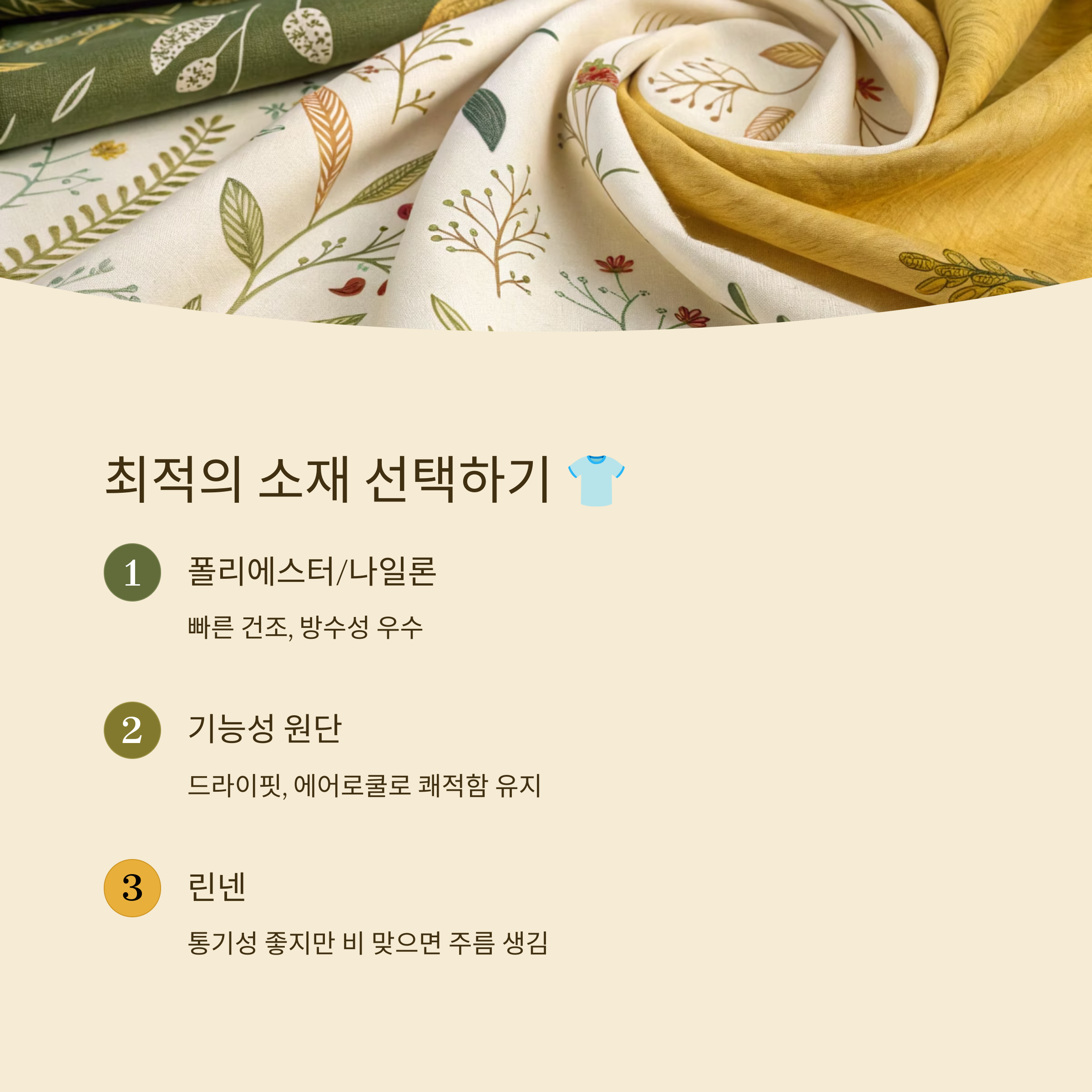 | 소재 | 건조 속도 | 통기성 | 장마철 적합도 |