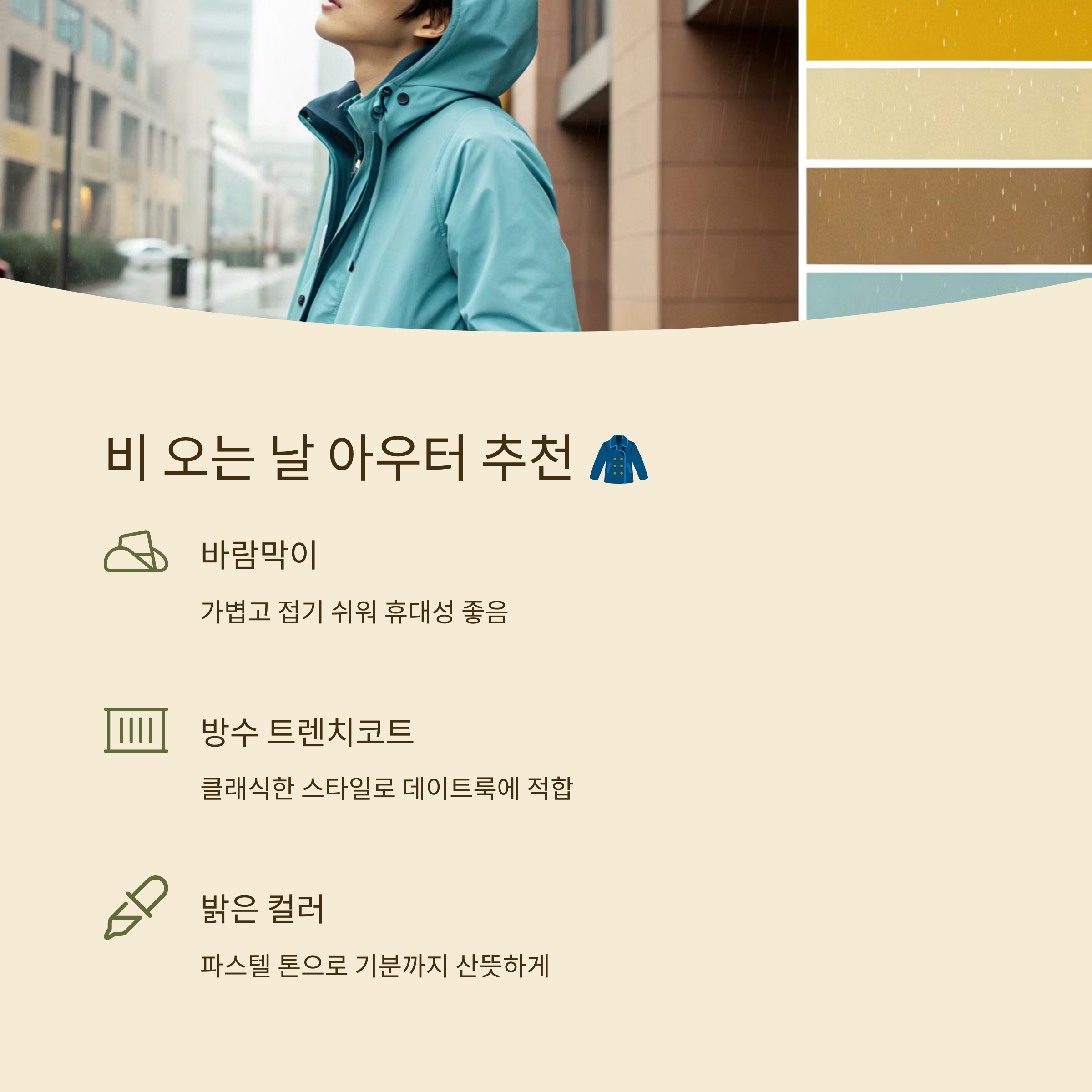 컬러는 밝은 톤을 추천해요. 어두운 날씨에 밝은 옷은 얼굴빛도 살려주고 기분까지 산뜻하게 만들어주거든요. 파스텔 블루나 연베이지 같은 색상이 인기 많고, 스트릿 패션을 좋아한다면 형광 포인트 아우터도 재미있게 매치할 수 있어요!
