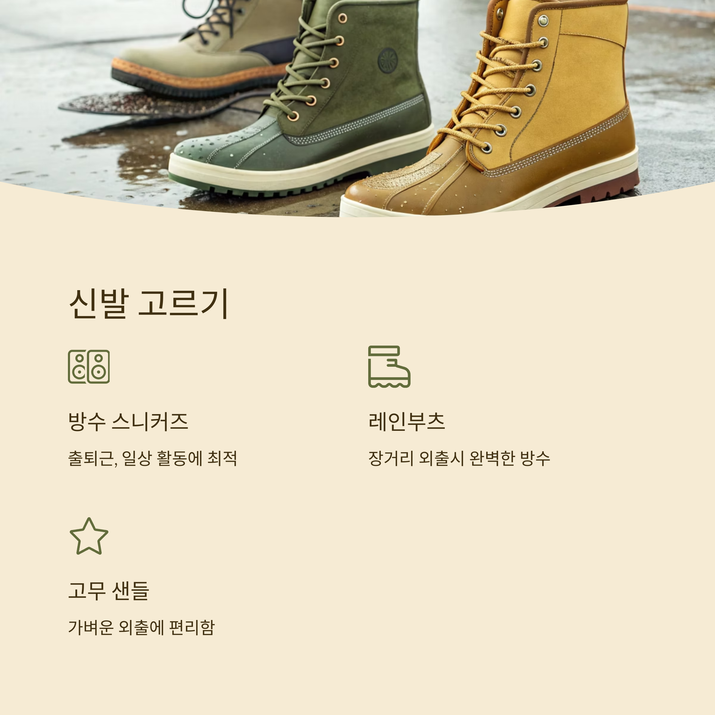 | 레인부츠 | 최고 | 낮음 | ★★★☆☆ | 장거리 외출 |