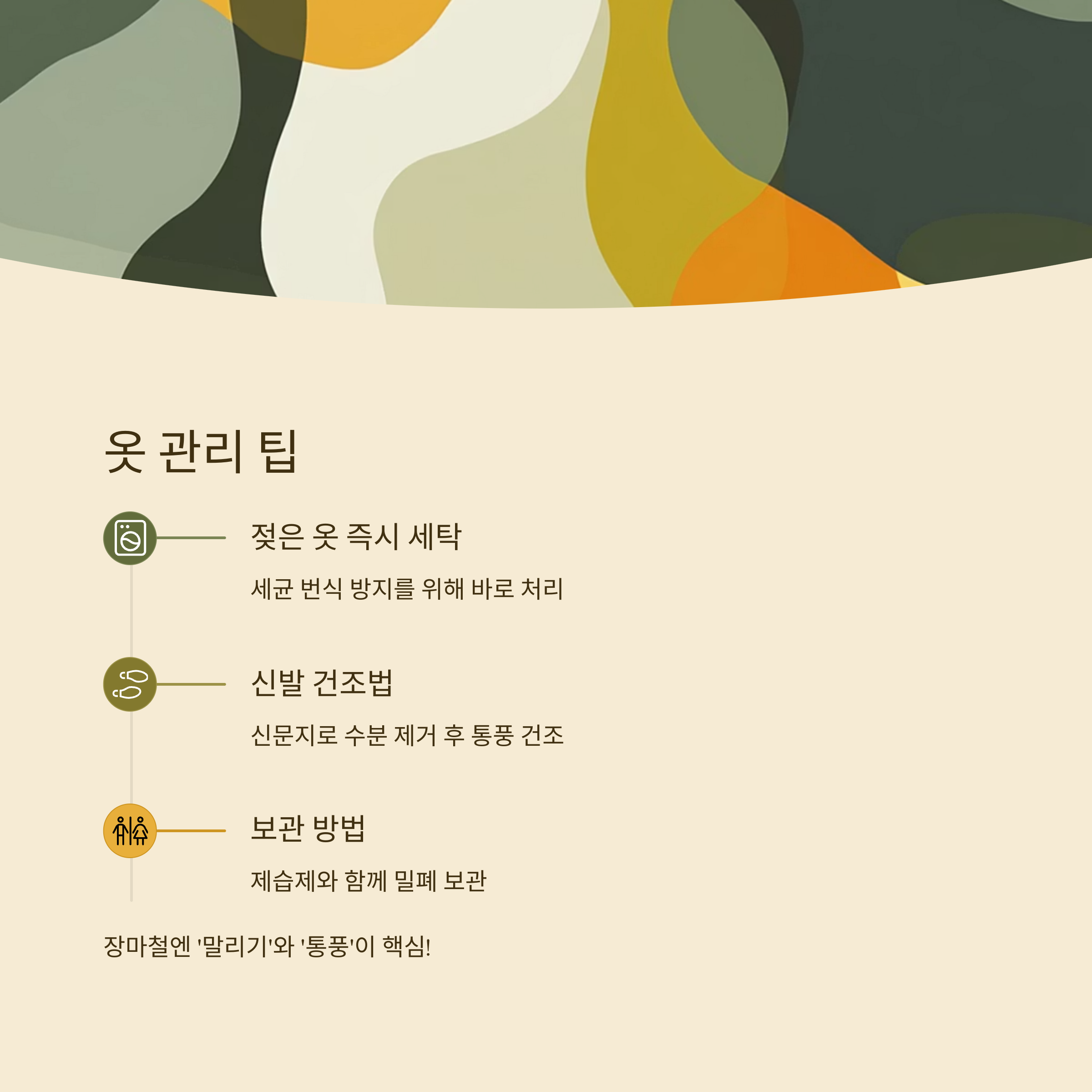 먼저 외출 후 젖은 옷은 바로 세탁하거나, 환기가 잘 되는 공간에 널어서 말려야 해요. 특히 겨드랑이, 목 부분 같은 땀이 많은 부위는 세균이 번식하기 쉬우니 세심하게 관리해줘야 한답니다. 얇은 기능성 옷은 세탁 후 금방 마르기 때문에 장마철엔 이런 옷을 여러 벌 돌려 입는 것도 좋은 방법이에요.
