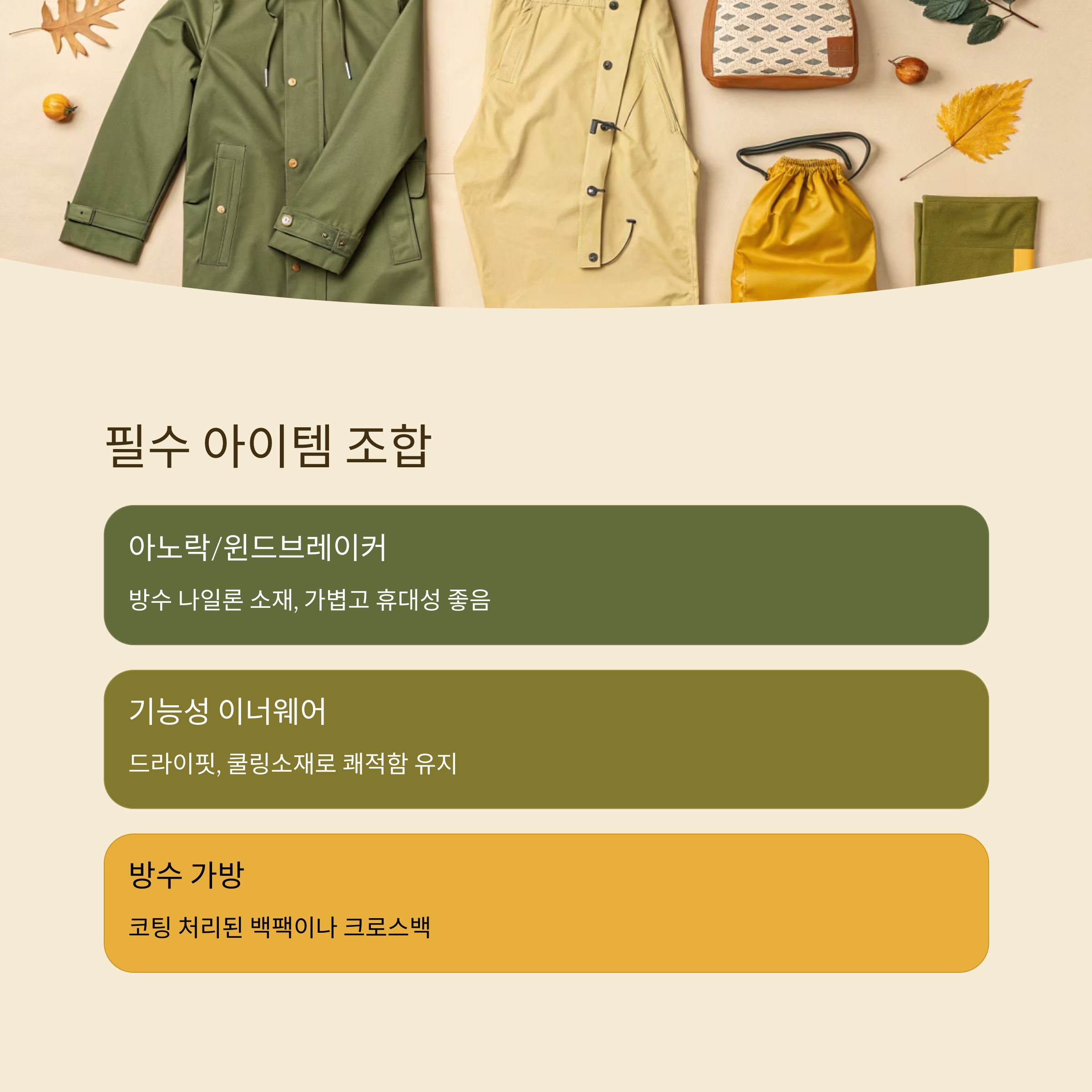 겉옷과 바지 외에도 작은 차이를 만드는 아이템이 있어요. 예를 들어, 방수 기능이 있는 백팩 커버나 미니 우산은 갑작스러운 비에도 실용적이에요. 특히 미니멀 스타일을 선호한다면, 크로스백 형태의 방수 가방도 스타일링에 깔끔하게 어울릴 수 있답니다.