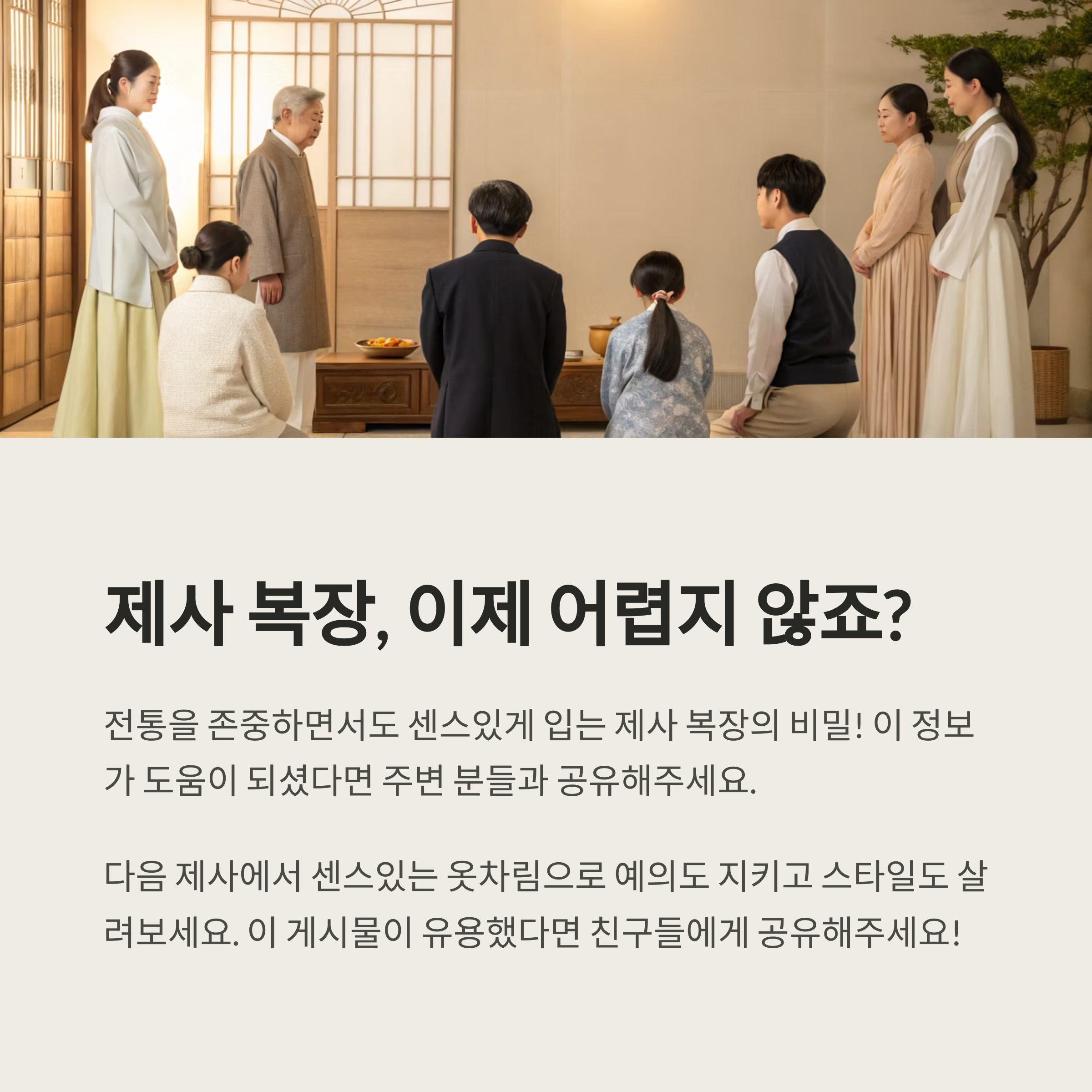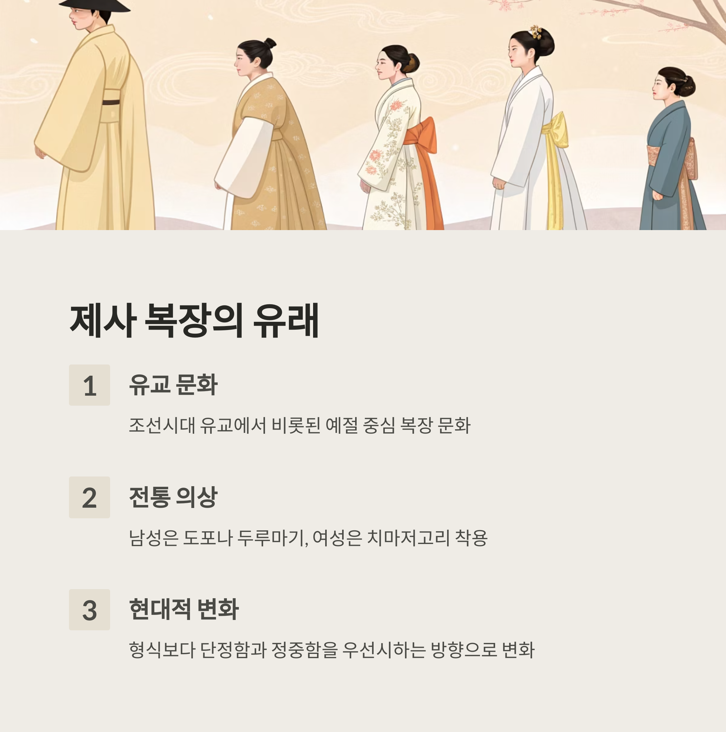 이처럼 시대에 따라 복장은 달라졌지만, 제사 복장에서 가장 중요한 가치는 ‘단정함’이에요. 그 마음만 변하지 않으면 어떤 형태도 존중받을 수 있답니다.