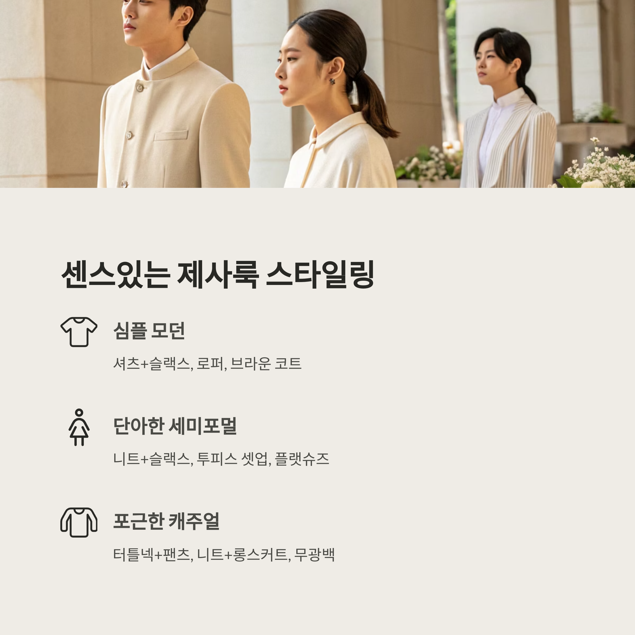 남성이라면 베이지톤 니트나 카디건을 활용해 부드러운 이미지를 줄 수 있고, 여성은 브이넥 블라우스나 셋업 느낌의 투피스가 단아한 분위기를 줄 수 있어요. 블랙이 부담스러우면 그레이나 브라운 계열도 괜찮아요.
