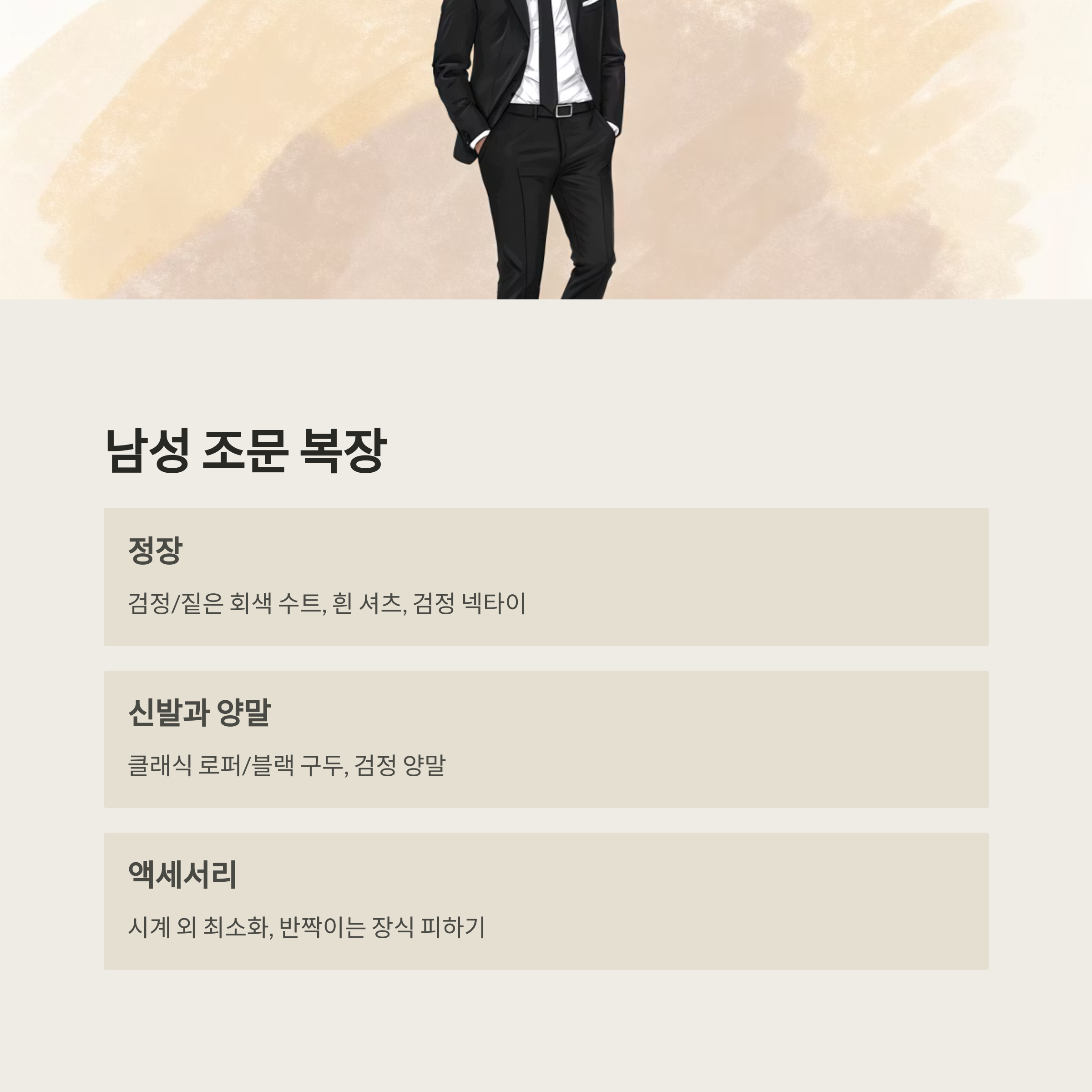 조문 복장은 마음가짐을 반영하는 외적인 표현이에요. 옷차림이 단정하면 자연스럽게 행동도 조심스러워지고, 유가족에게도 정중한 인상을 남기게 되죠.
