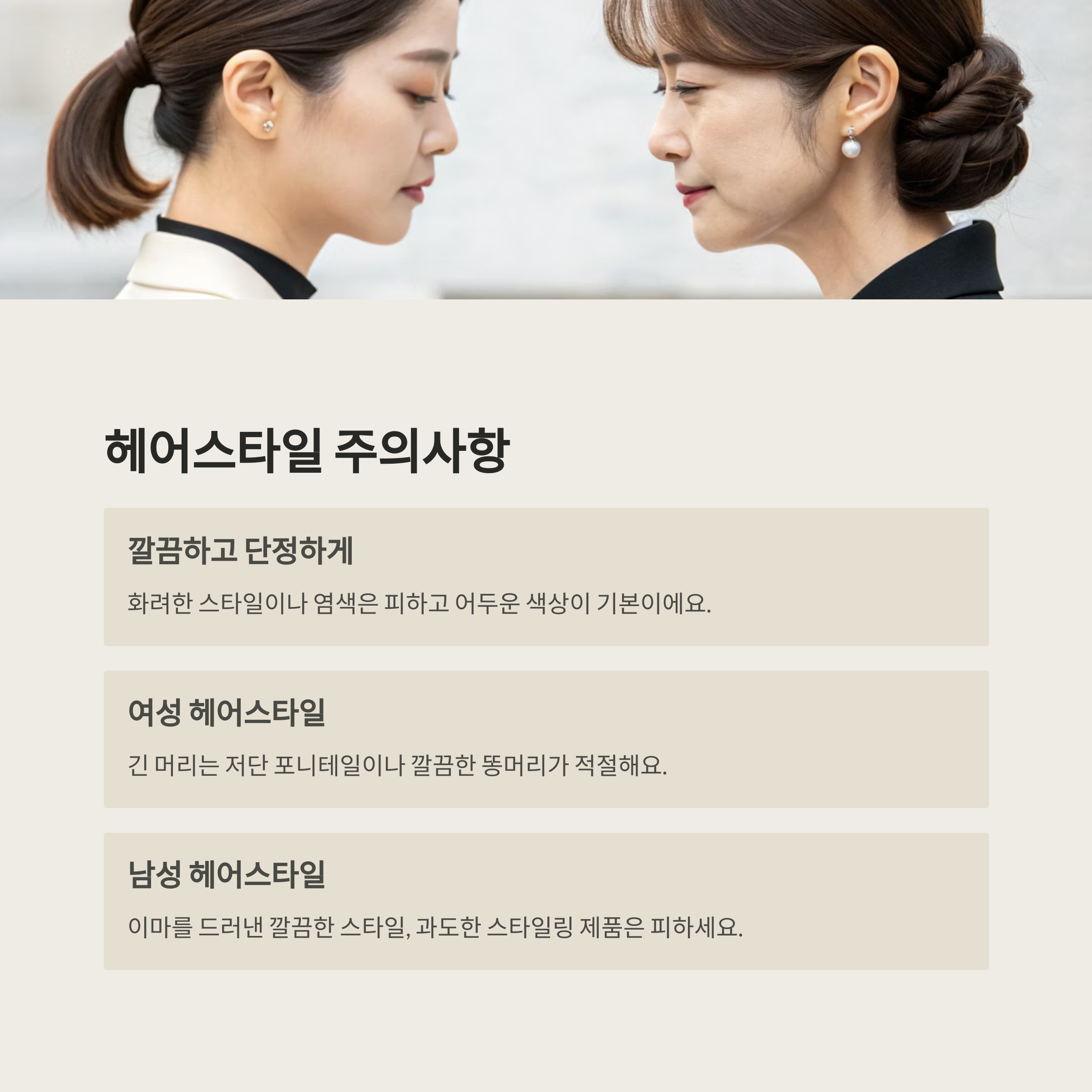 여성은 의상 외에도 메이크업, 악세서리, 네일 등 챙겨야 할 요소가 많기 때문에 더욱 세심한 주의가 필요해요. 조문은 남녀 불문하고 단정함과 절제된 태도가 가장 중요한 기준이에요.