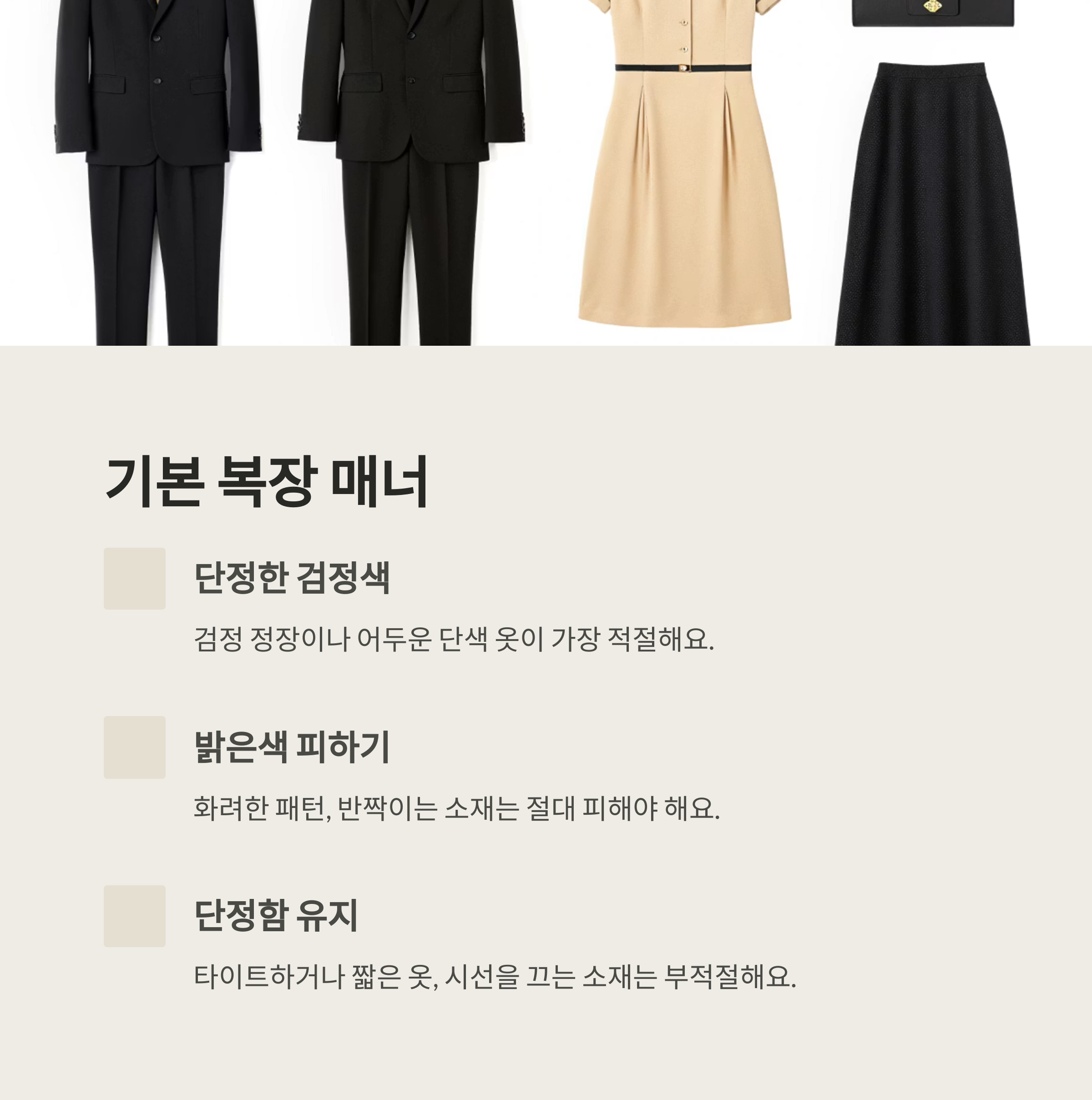 여성의 경우 지나치게 타이트하거나 짧은 치마는 삼가야 해요. 몸매를 강조하거나 지나치게 드러나는 옷은 조문 복장으로 적합하지 않기 때문이에요. 또 소재가 레이스나 시스루처럼 시선을 끌 수 있는 옷도 피하는 게 좋아요.