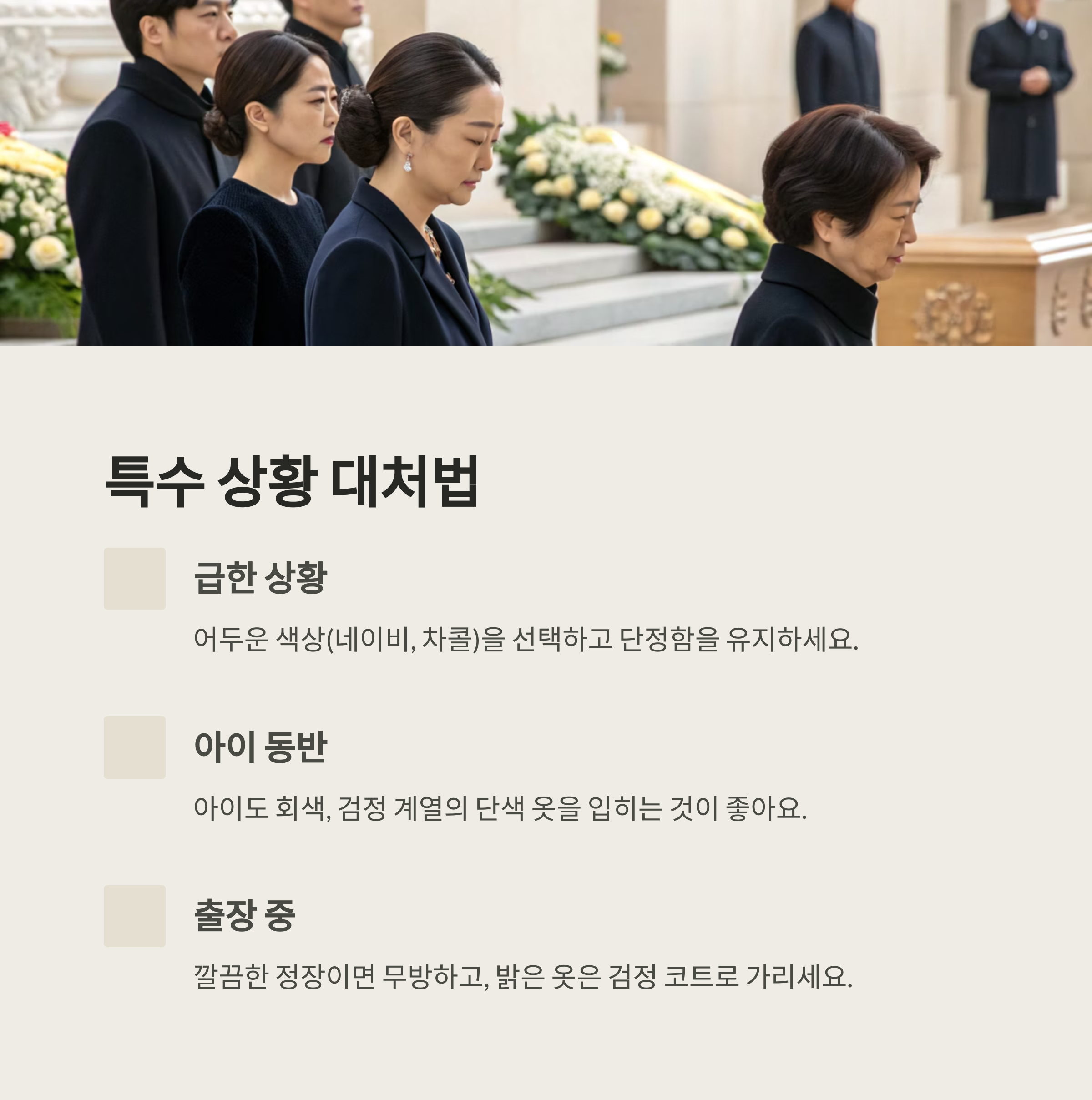 외국에서 돌아온 직후나 비즈니스 출장 중이라면 깔끔한 정장 차림이면 무방해요. 만약 원색이나 밝은 옷만 있다면, 검정 코트를 겉에 걸치고 조용히 조문하는 방법도 있어요. 중요한 건 마음과 태도니까요.