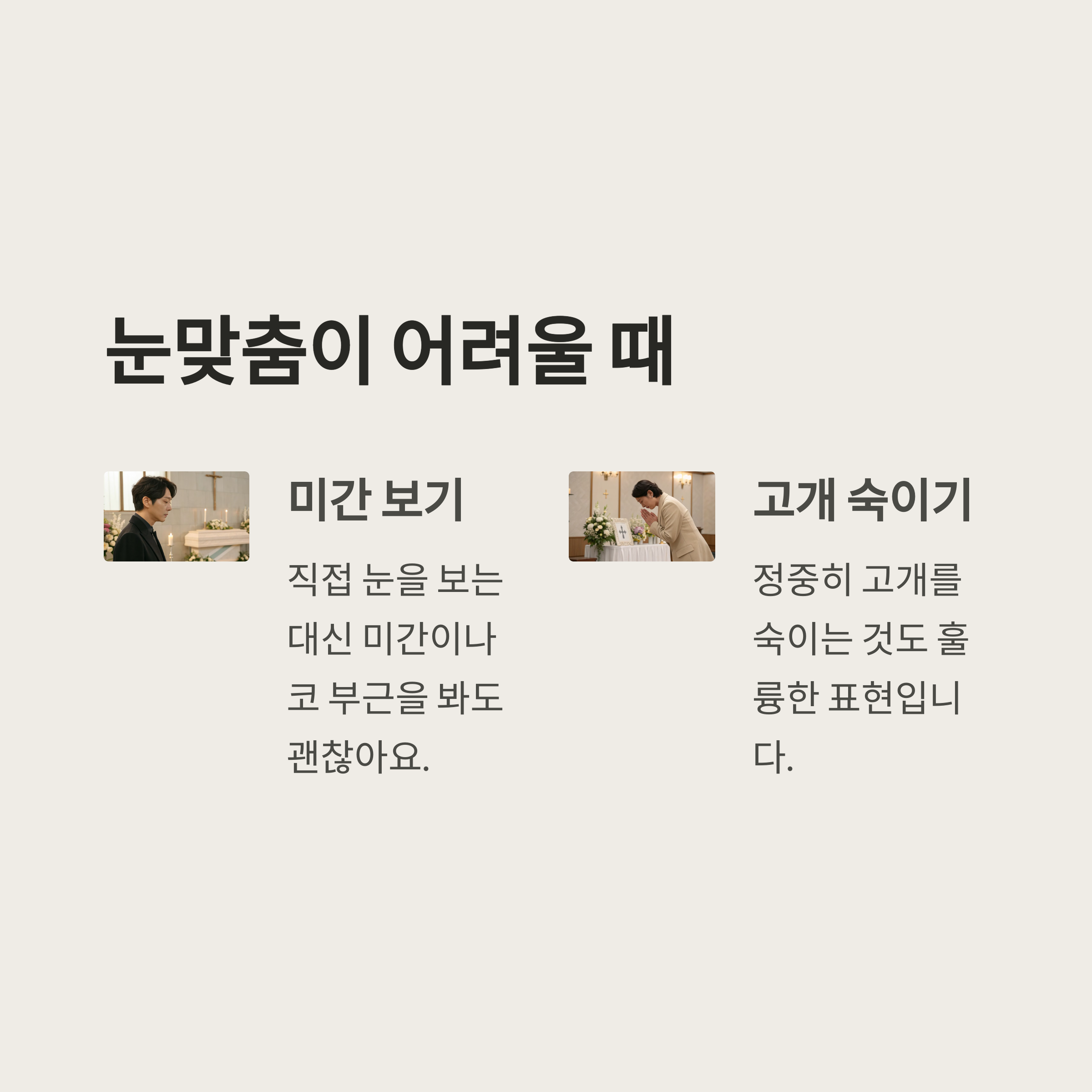 눈맞춤이 어려운 사람일수록, 조문 인사에서 다른 비언어적 표현을 활용하는 게 좋아요. 말투, 손짓, 인사하는 자세 등으로 마음을 전달할 수 있어요. 중요한 건 ‘어떻게 보이느냐’보다 ‘어떤 마음으로 있느냐’이니까요.