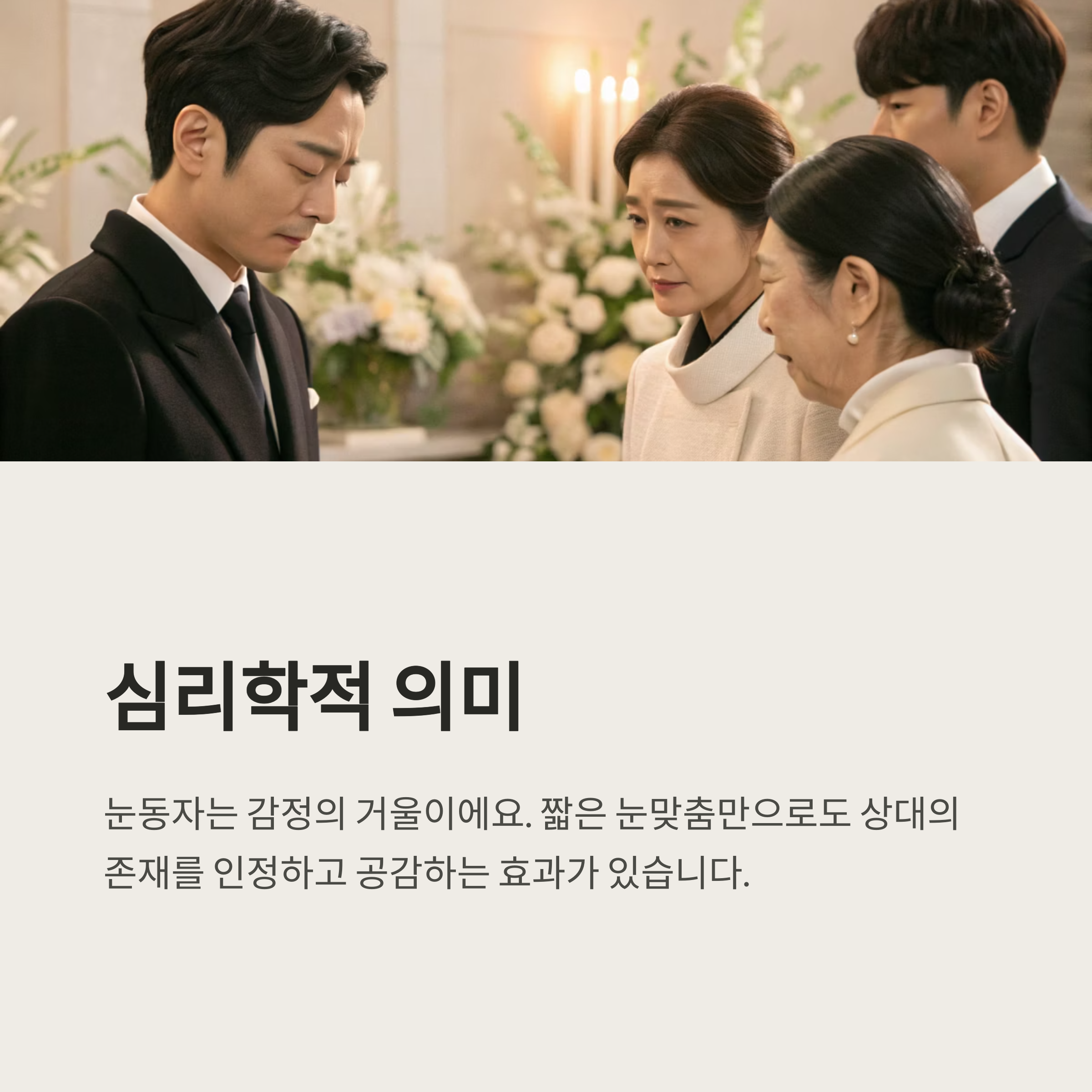 조문은 공감의 자리예요. 심리적으로 보면 눈을 맞춘다는 건 그 공감의 시작점을 만들어주는 행위예요. 조문객이 먼저 시선을 건네고, 유족이 받아줄 수 있는 상태일 때 조용히 눈을 마주치는 건 마음을 나누는 방식 중 하나로 매우 의미가 있답니다.