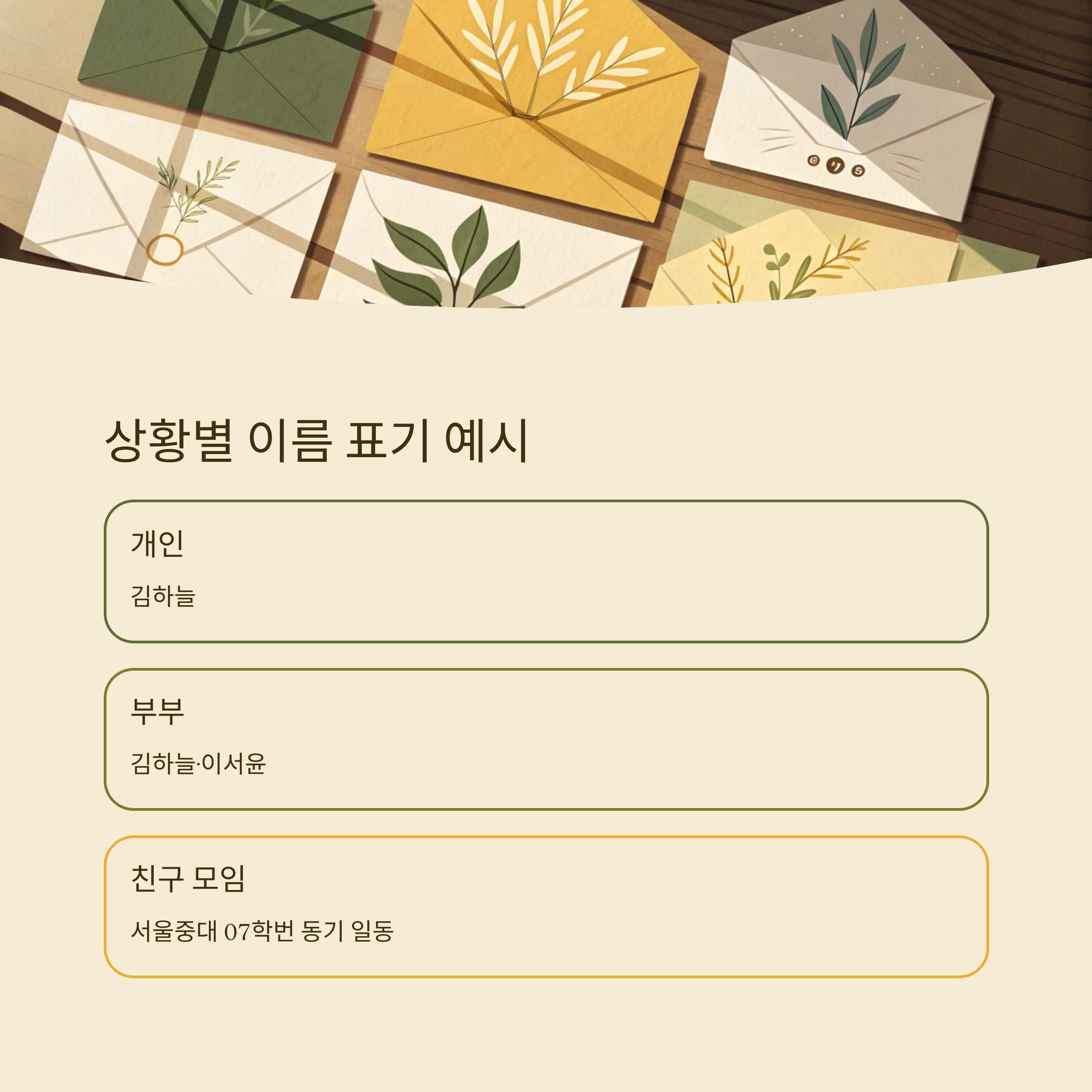 그럼 이제 실제로 이름을 어떻게 쓰면 좋을지, 상황별로 살펴보는 실전 예시들을 준비했어요. 개인, 부부, 친구 모임, 회사 등 다양한 경우를 하나하나 확인해볼게요!