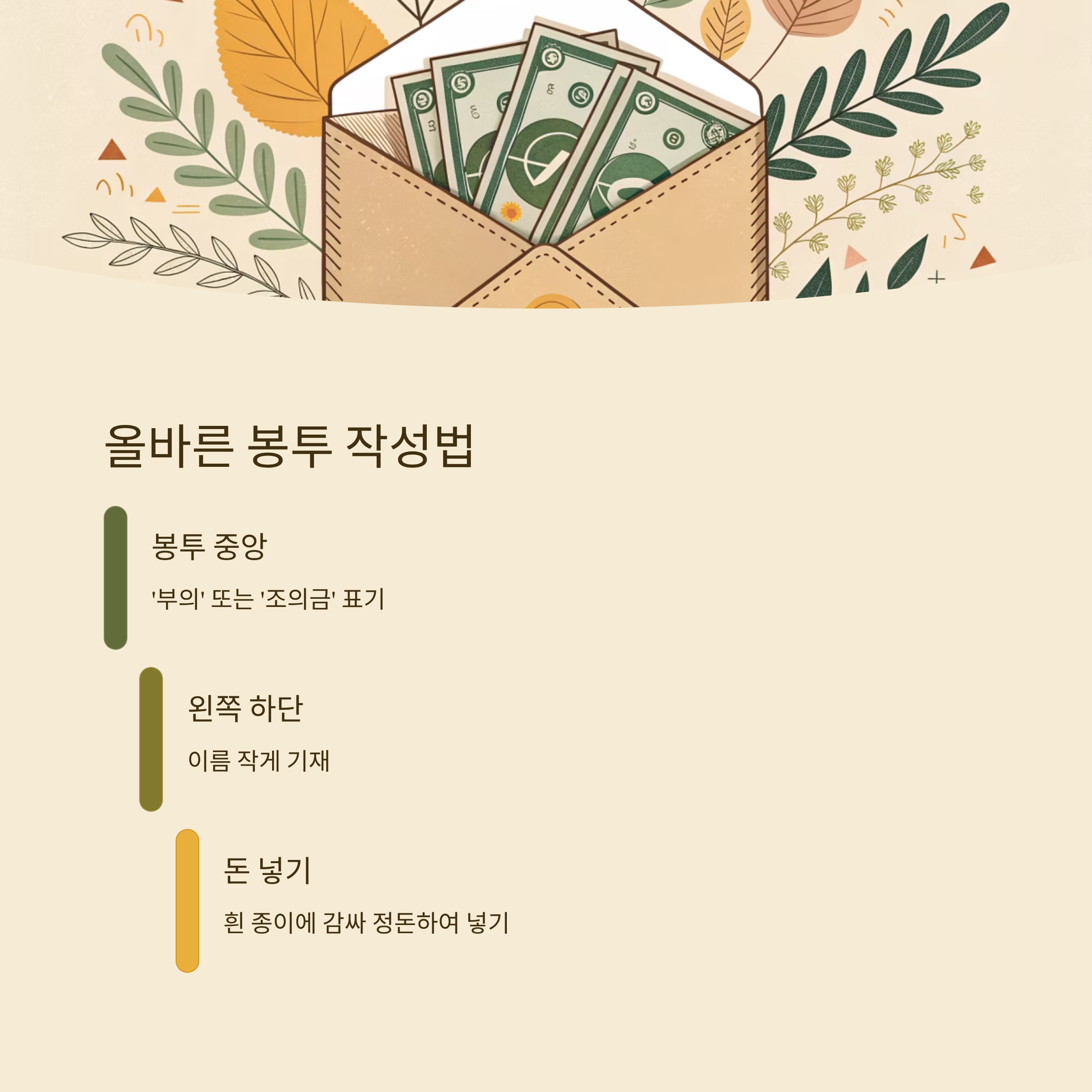 봉투 겉면에 너무 많은 말을 적는 것도 실례가 될 수 있어요. 간단하게 ‘조의금’ 또는 ‘부의’ 정도로만 표기하고, 따로 전하고 싶은 말이 있다면 짧은 메모로 안에 넣는 것이 예의에 맞아요.