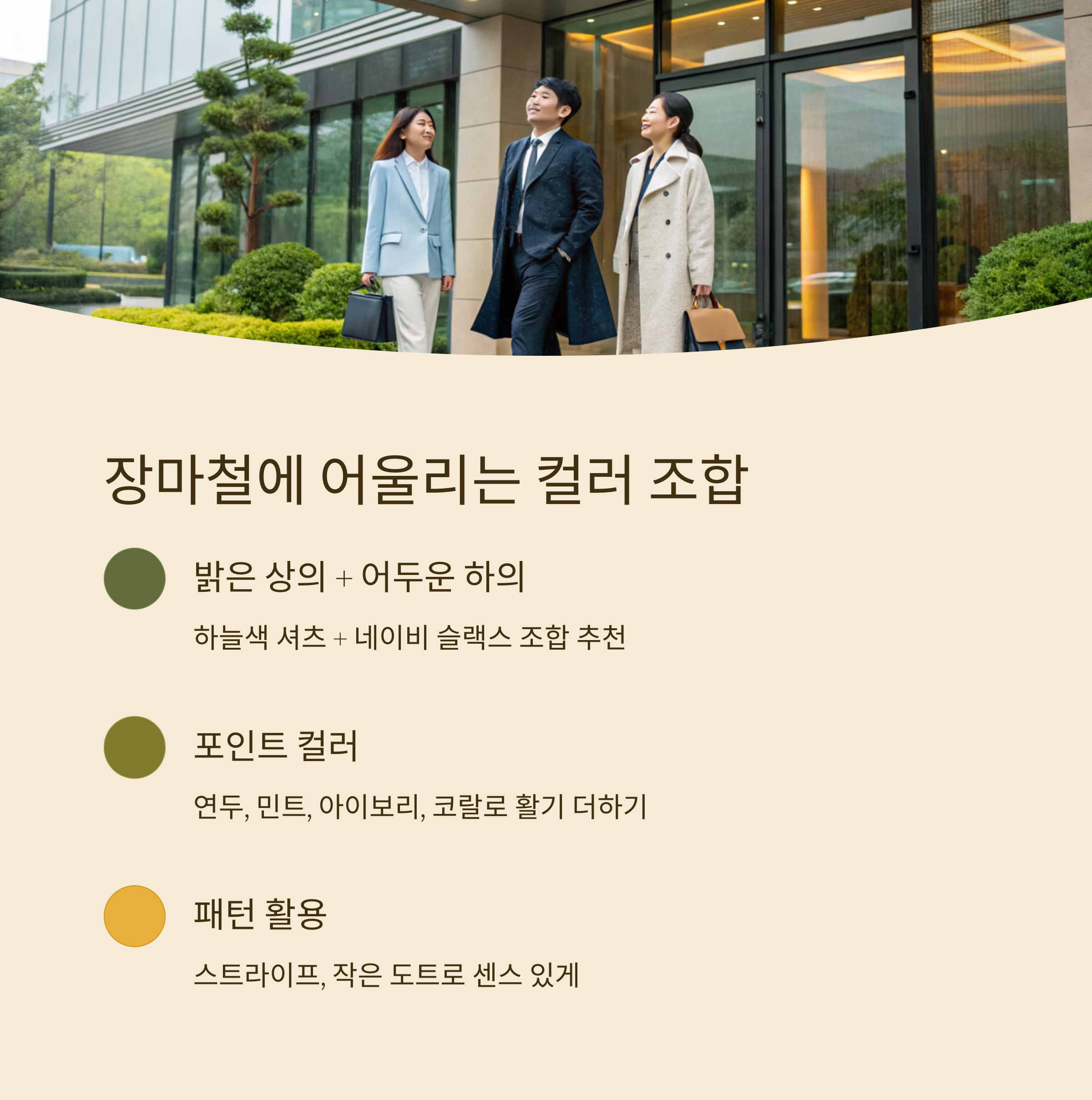 이처럼 스타일을 완전히 바꾸기보다는 상황에 맞는 아이템을 조화롭게 더해주는 것이 중요하답니다.