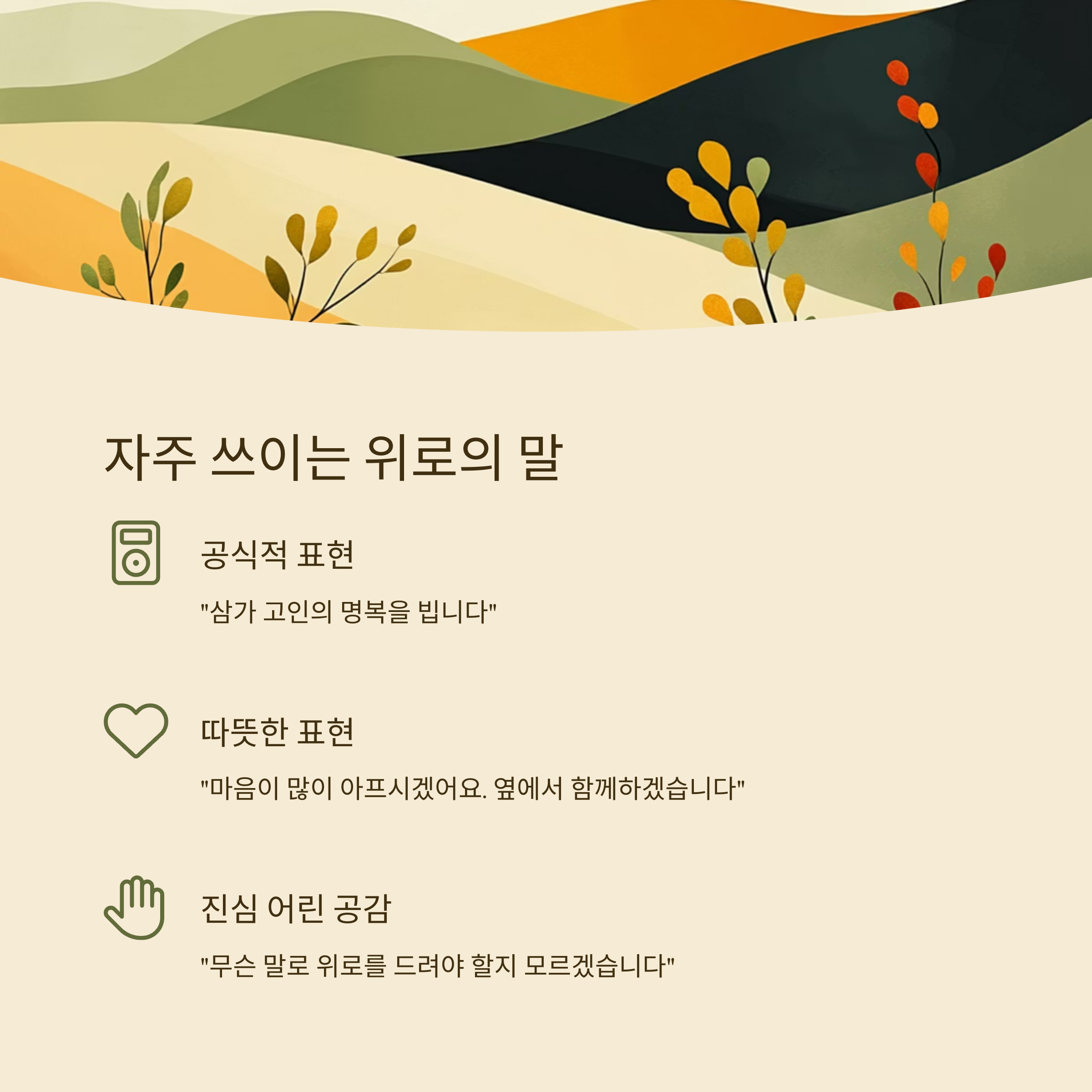 이런 표현들은 유족의 감정을 존중하고, 부담스럽지 않게 다가갈 수 있는 말들이에요. 상황에 따라 적절하게 활용해 보세요.
