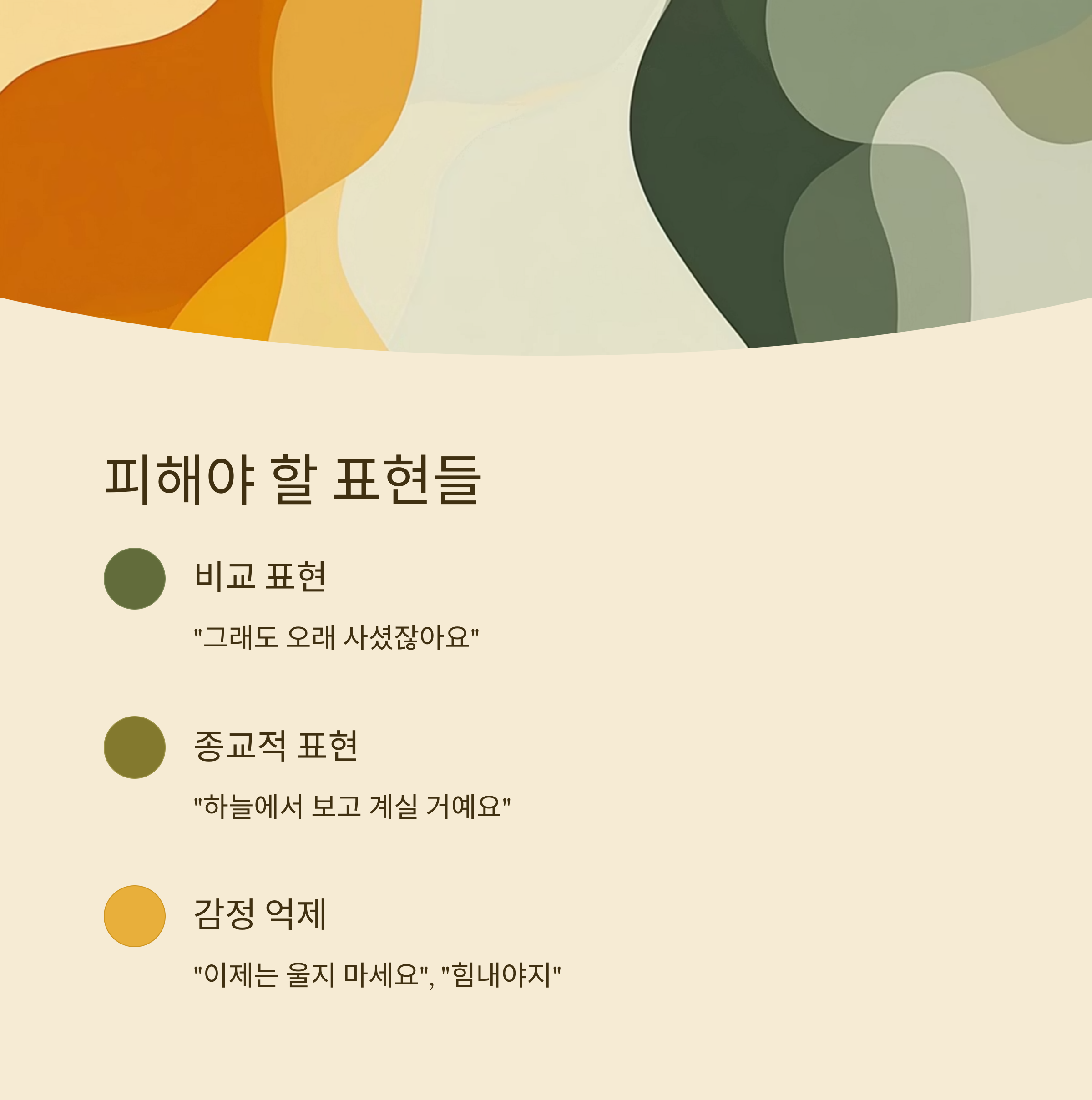 아무리 위로하고 싶은 마음이 크더라도, 상황에 맞지 않는 말은 오히려 유족에게 상처가 될 수 있어요. 가장 피해야 할 말 중 하나는 "그래도 오래 사셨잖아요" 같은 표현이에요. 남은 사람의 슬픔을 평가하는 말은 절대 금물이에요.