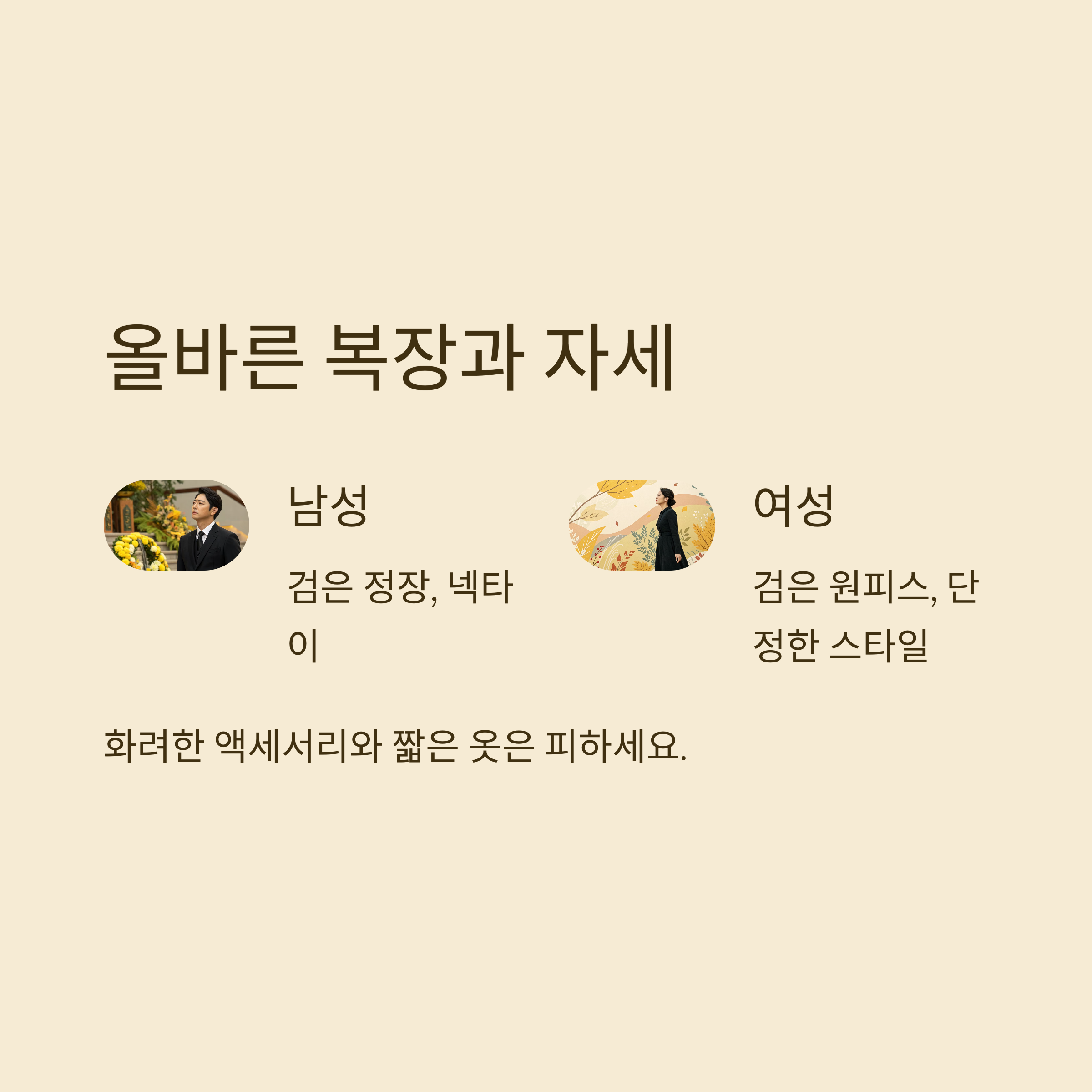 복장에 지나친 액세서리나 화려한 화장은 삼가야 해요. 너무 짧은 치마나 노출이 심한 의상도 피하는 것이 예의예요. 슬리퍼나 운동화보다는 정장 구두나 단정한 로퍼를 신는 것이 좋아요. 외투는 빈소 입장 전에 벗는 것이 기본이고, 모자는 착용하지 않는 것이 원칙이에요.