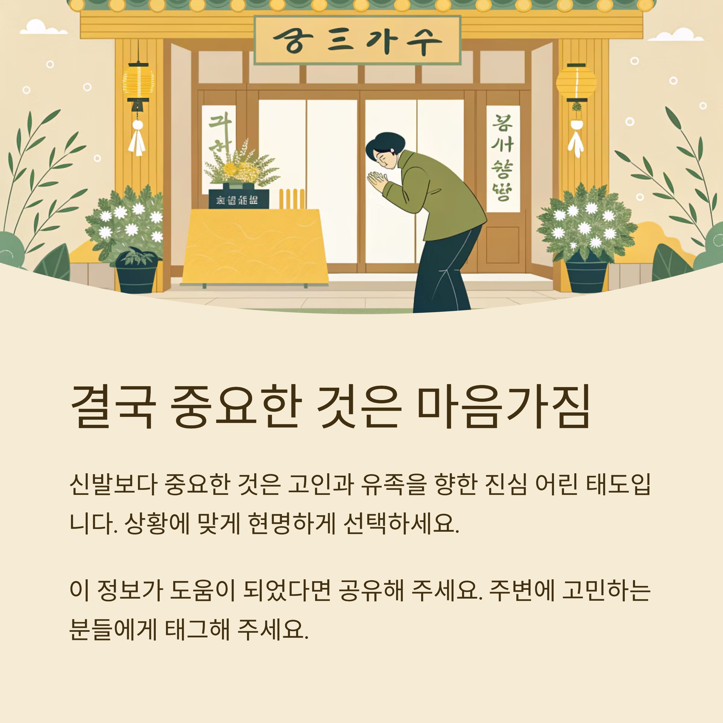 ※ 본 글은 일반적인 조문 예절과 사례를 바탕으로 작성되었으며, 특정 상황과 개인의 가치관에 따라 판단이 달라질 수 있습니다.