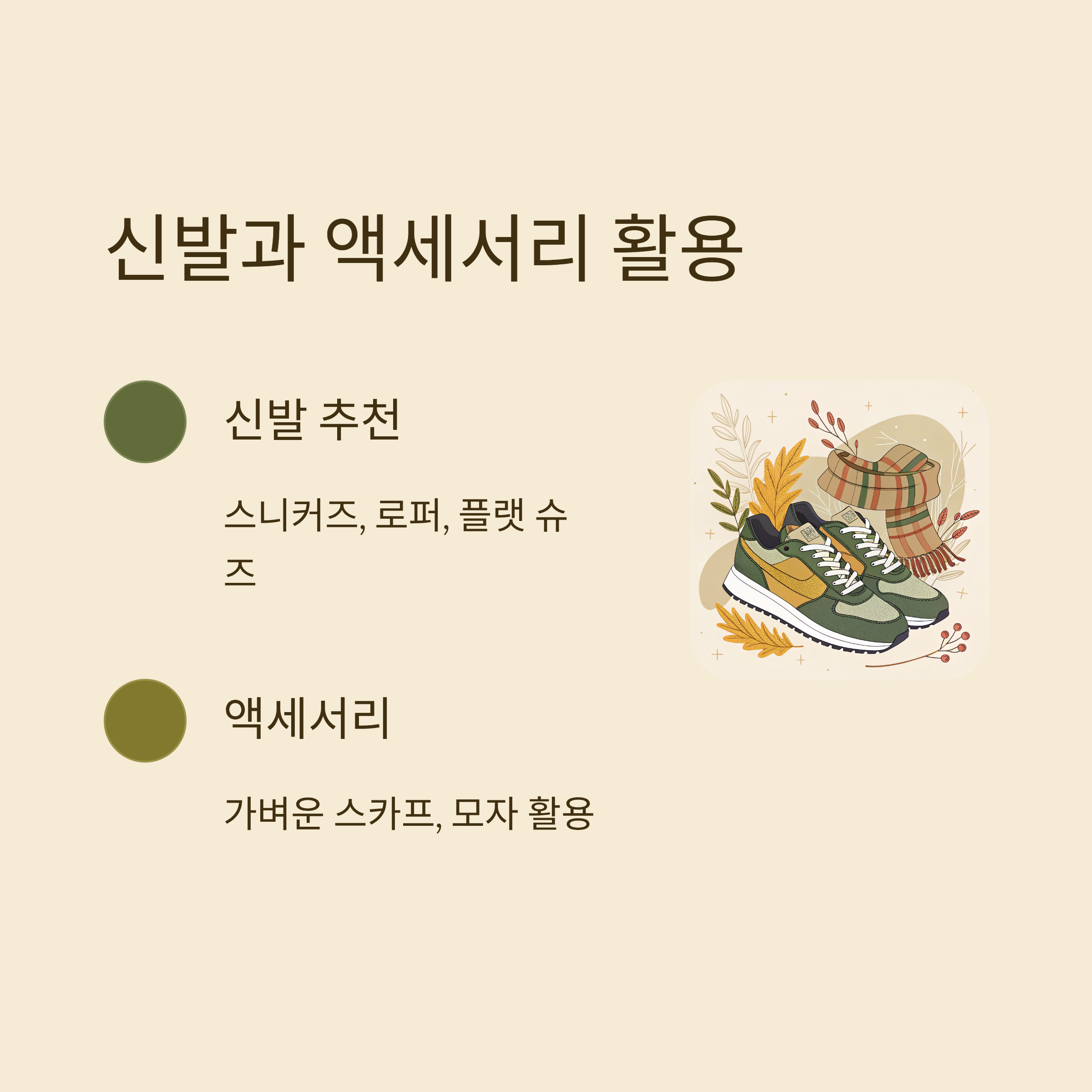 액세서리는 가볍게 스카프나 모자를 활용하면 좋아요. 스카프는 체온을 조절하는 데 도움이 되고, 스타일 포인트로도 딱이에요. 작은 가방이나 백팩은 활동성을 높여주기 때문에 함께 고려해보면 좋아요.