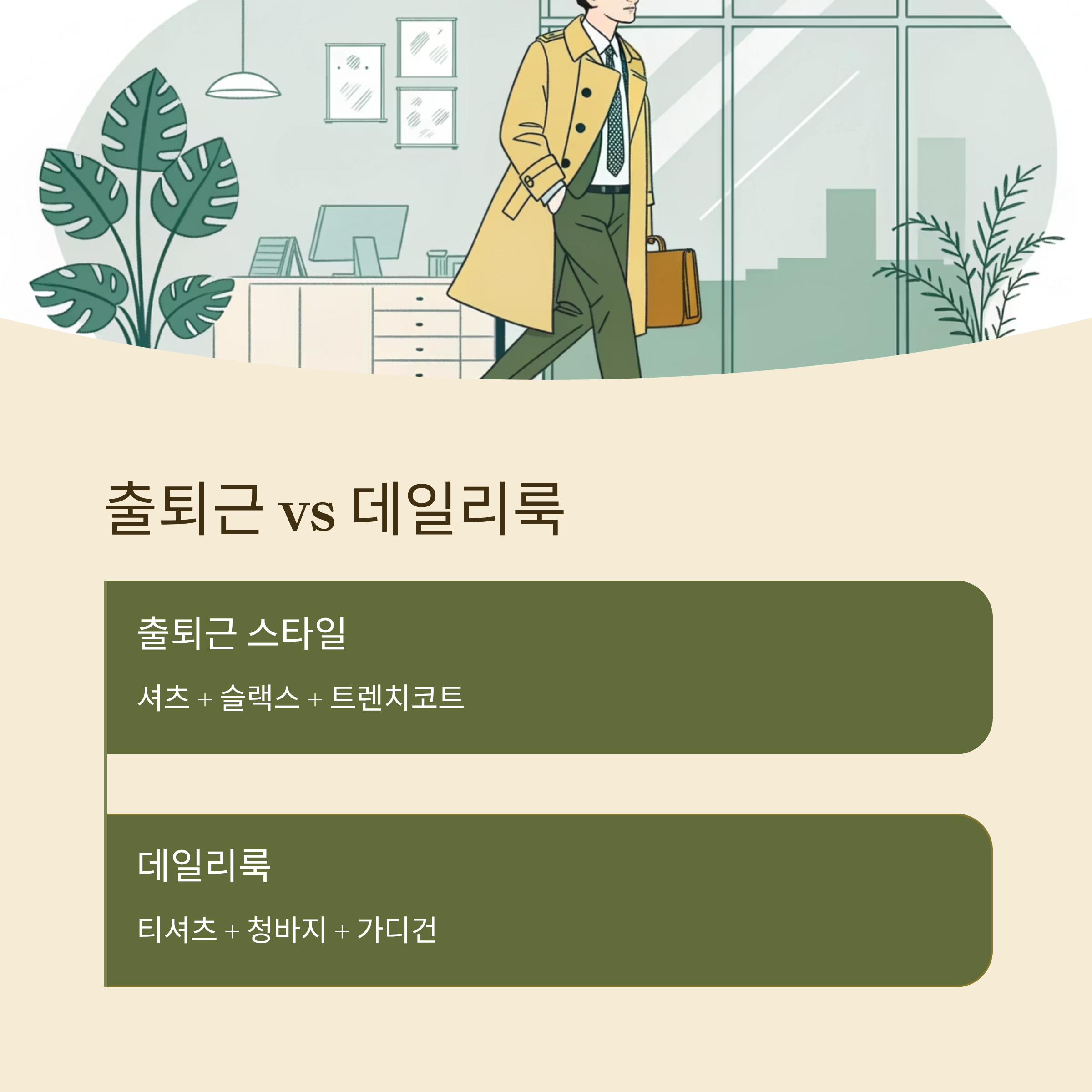 출퇴근길에는 셔츠와 슬랙스에 트렌치코트 조합이 단정해 보여요. 데일리룩으로는 티셔츠에 청바지, 가디건 조합이 가장 실용적이에요. 옷차림을 단순화하면 아침에 옷 고르는 시간이 줄어드는 장점도 있어요.