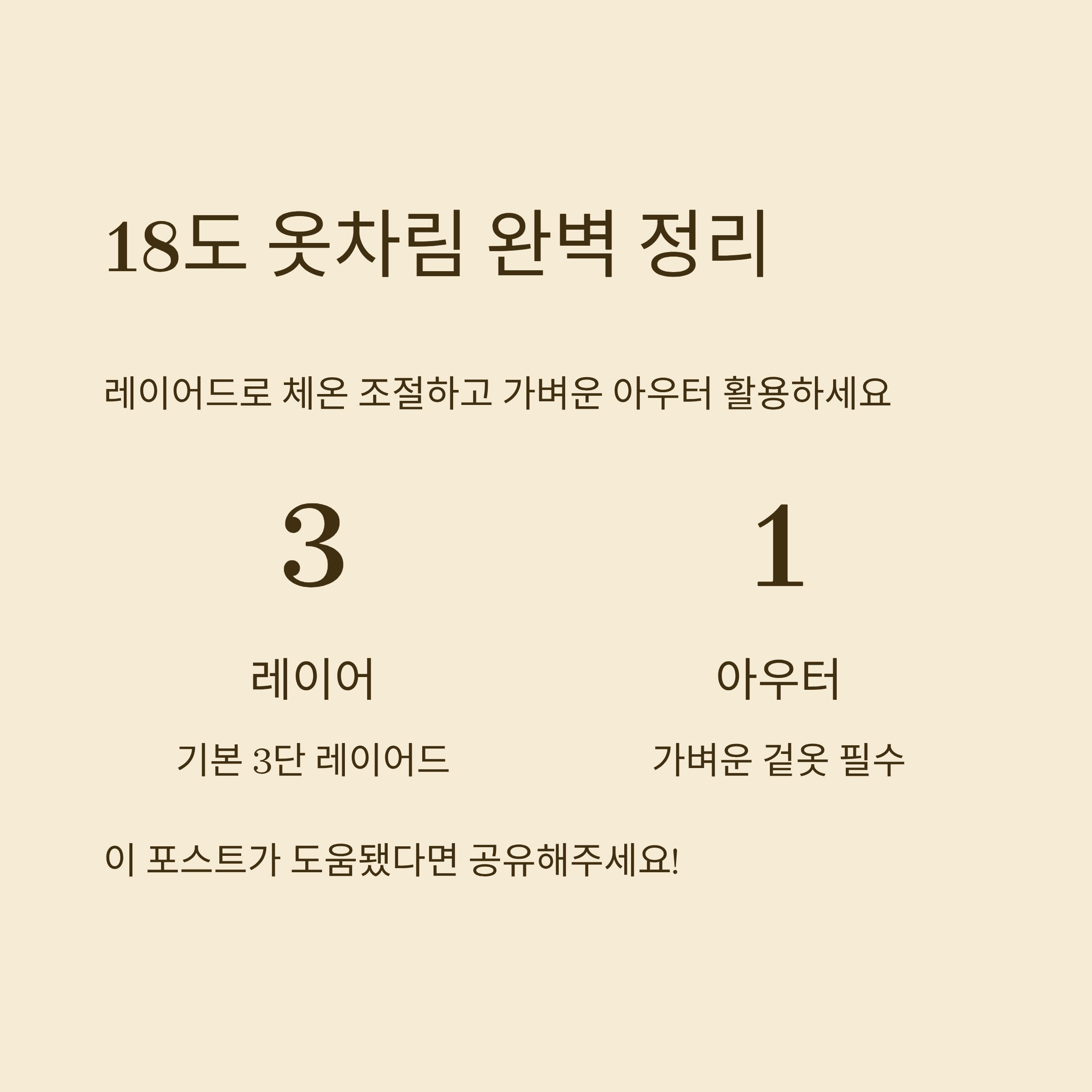 18도는 포멀과 캐주얼 모두 소화하기 좋은 기온이기 때문에 옷차림에 따라 분위기를 자유롭게 바꿀 수 있어요. 출근길에는 깔끔하게, 퇴근 후에는 편안하게 조절하면 하루가 훨씬 여유롭답니다.
