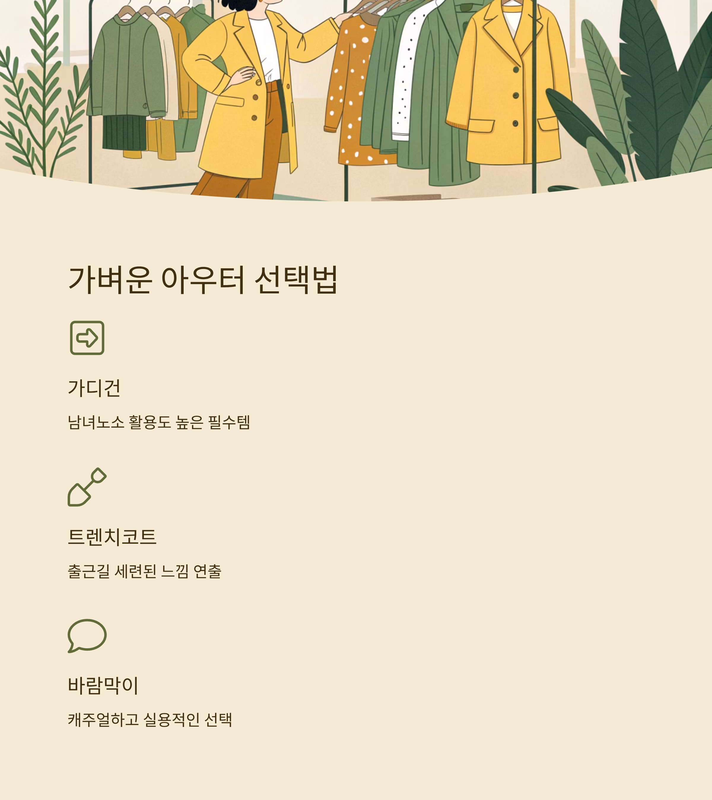 트렌치코트는 출근길에 세련된 느낌을 주고, 바람막이는 캐주얼하면서도 실용적이에요. 가디건은 어디에든 잘 어울려서 남녀노소 모두 활용하기 좋아요. 상황에 따라 아우터를 맞추면 훨씬 편안하답니다.