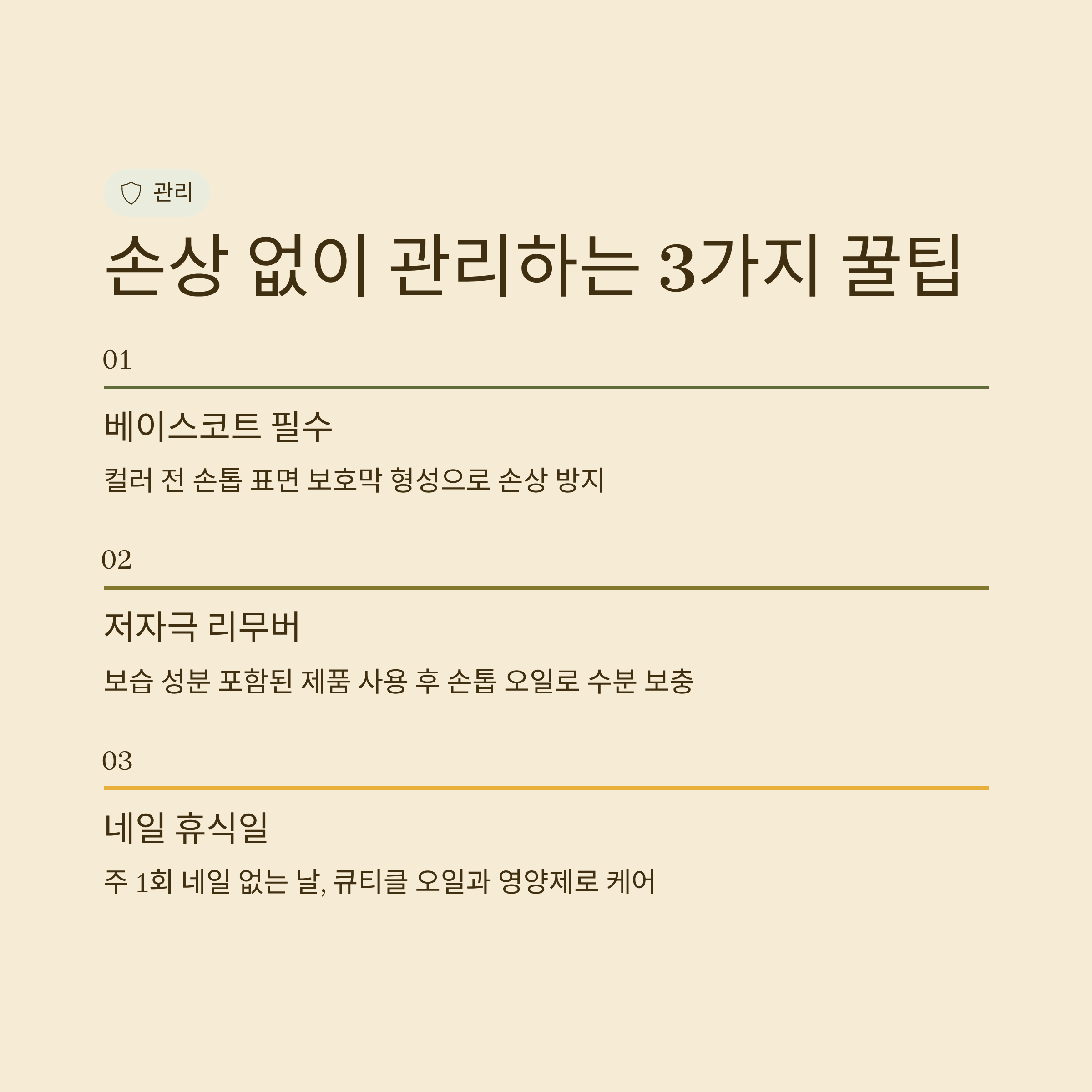 | 저자극 리무버 | 아세톤 성분 줄인 제품 사용 | 네일 제거 시 |