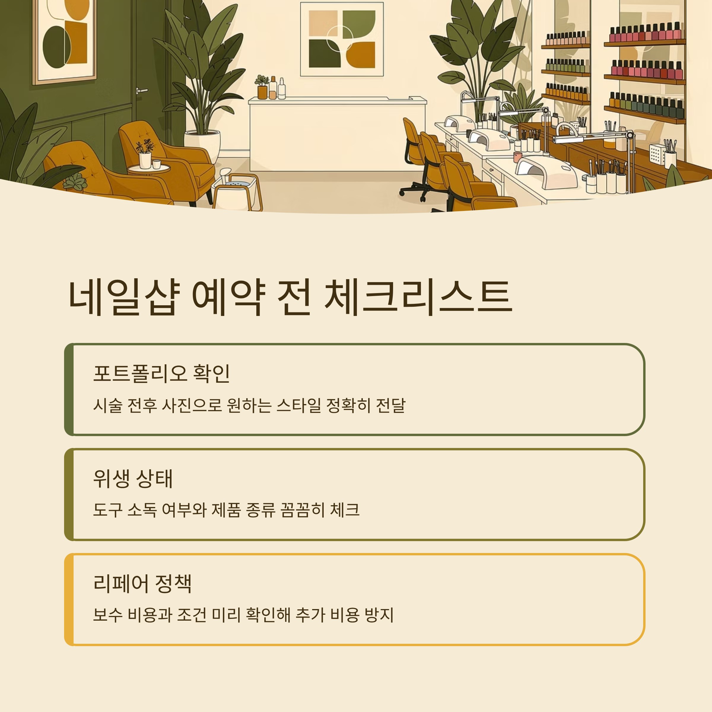 네일샵에 가기 전엔 몇 가지 체크해야 할 게 있어요. 첫째, 시술 전후 사진이 있는 포트폴리오를 꼭 확인하세요. 원하는 스타일을 말할 때에도 사진을 보여주는 게 가장 정확해요.