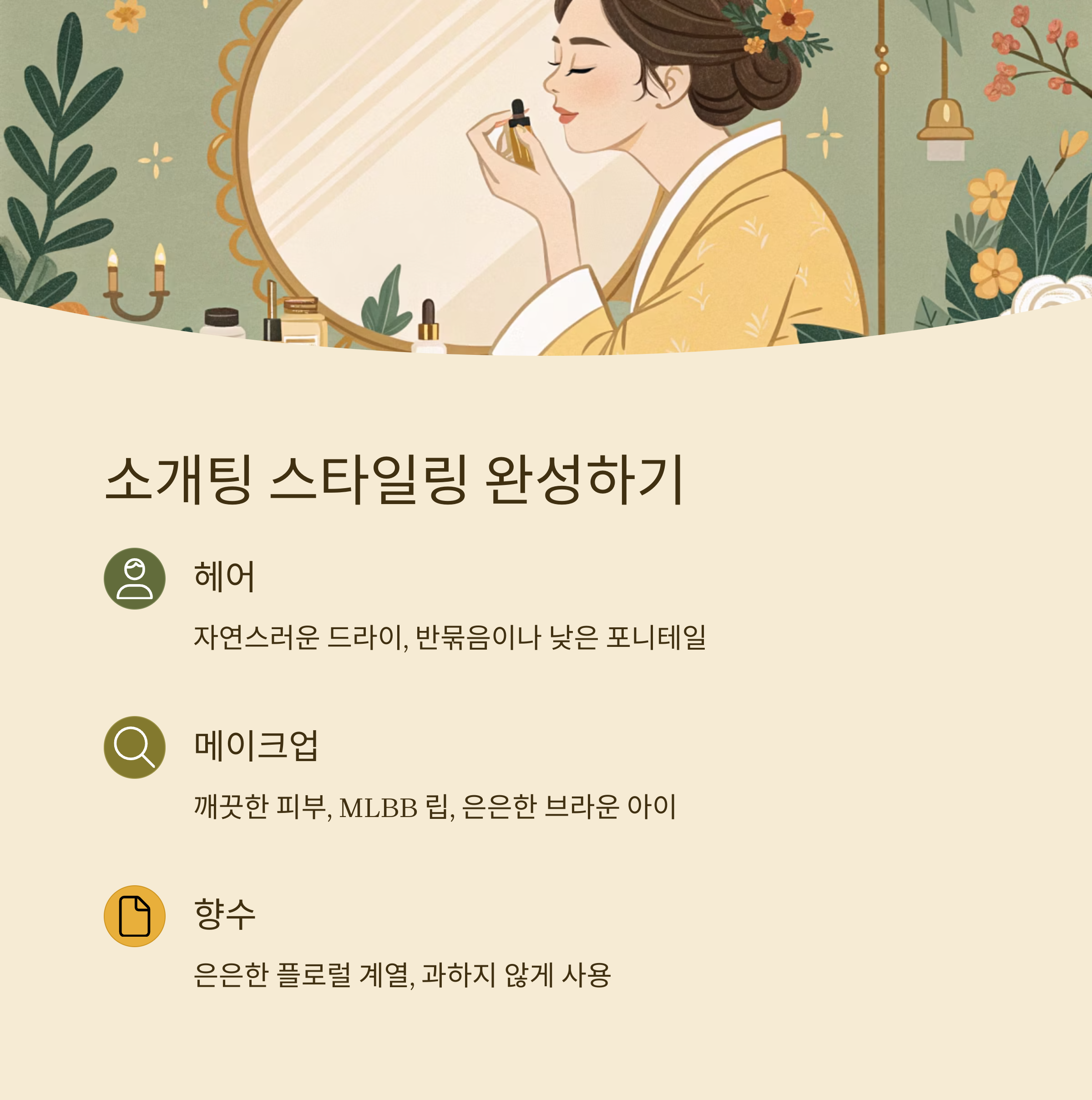 | 향수 | 플로럴 계열, 은은하게 | 3회 이상 분사 ❌ |