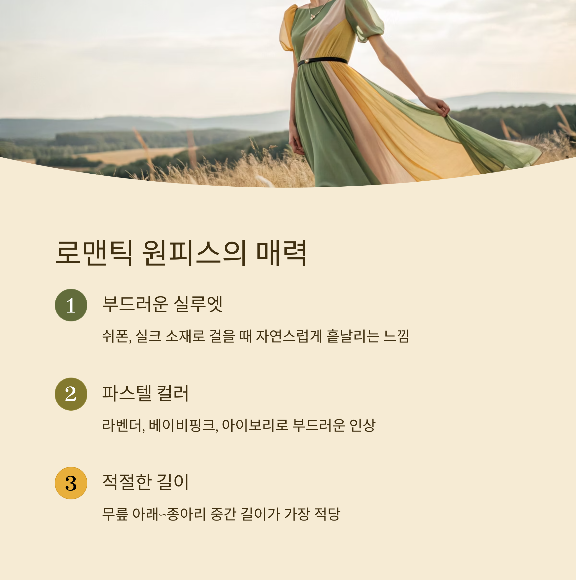 길이는 무릎 살짝 아래나 종아리 중간 정도가 가장 적당해요. 너무 짧거나 너무 긴 원피스는 부담을 줄 수 있어서 적절한 길이와 핏이 중요하죠. 허리를 살짝 잡아주는 디자인이면 더욱 여성스럽게 보여요.