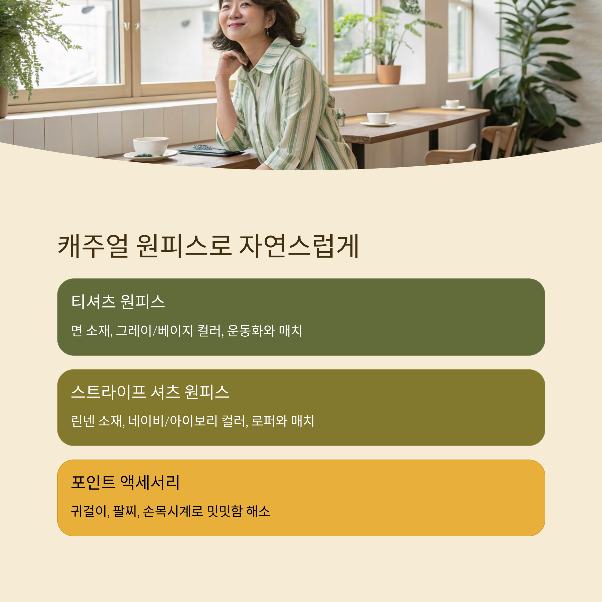 자칫 밋밋해 보일 수 있는 스타일에는 간단한 액세서리를 더해주는 게 좋아요. 귀걸이나 팔찌, 손목시계 하나만 해도 전체적인 느낌이 확 달라진답니다 😊