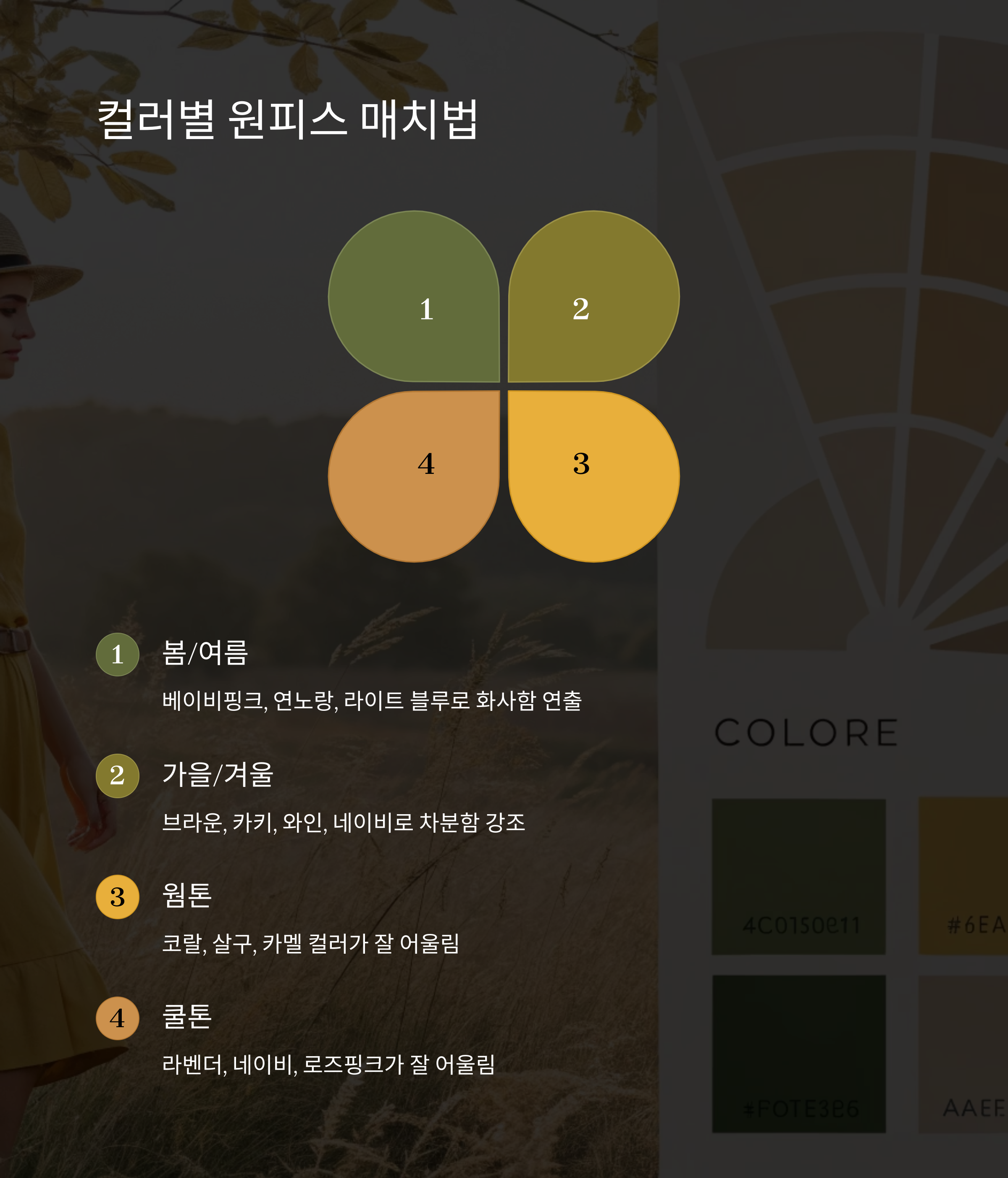 | 계절 | 추천 컬러 | 피부톤 | 매치 아이템 | 느낌 |