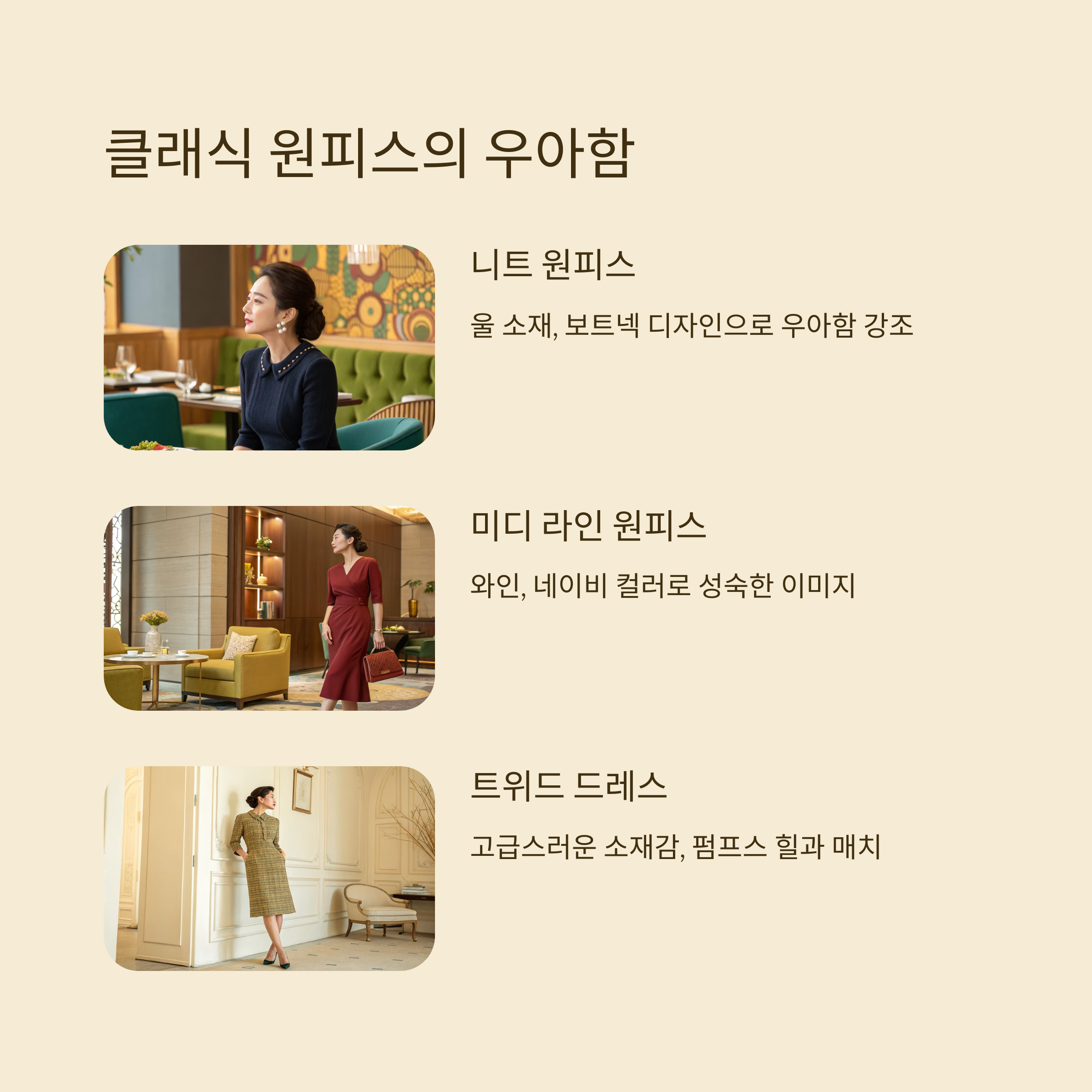 클래식한 스타일에는 블랙, 네이비, 와인 컬러가 제격이에요. 여기에 진주 귀걸이나 고급스러운 클러치를 매치하면 격식 있는 자리에도 손색없어요. 신발은 심플한 펌프스 힐이 좋아요 👠