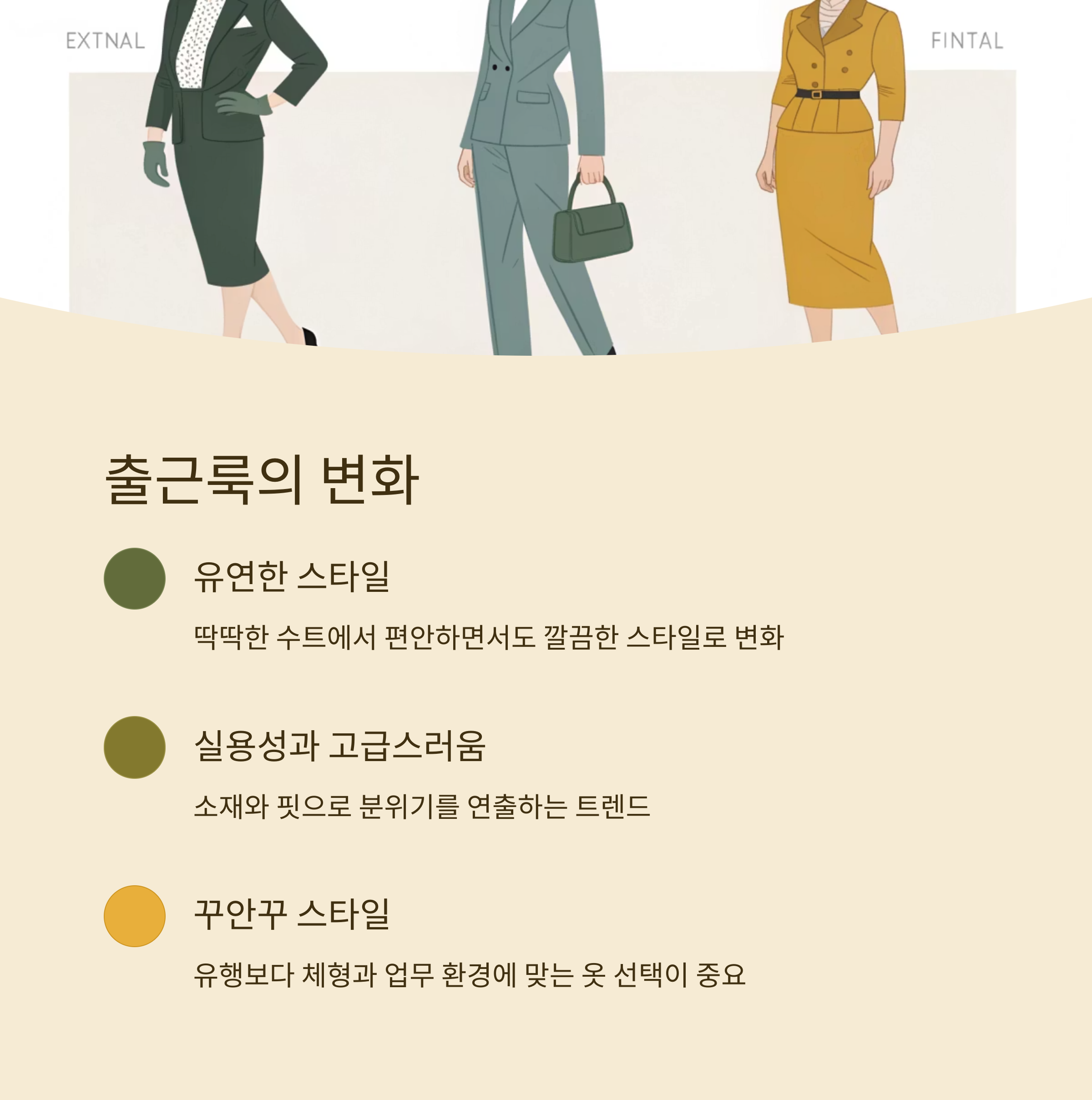 트렌드를 따르기보다는 본인의 체형과 톤, 업무 환경에 맞는 옷을 고르는 것이 더 중요해요. 예전에는 유행 아이템이 중심이었지만, 이제는 ‘꾸안꾸’ 스타일이 일상 출근복의 기준이 되었어요.