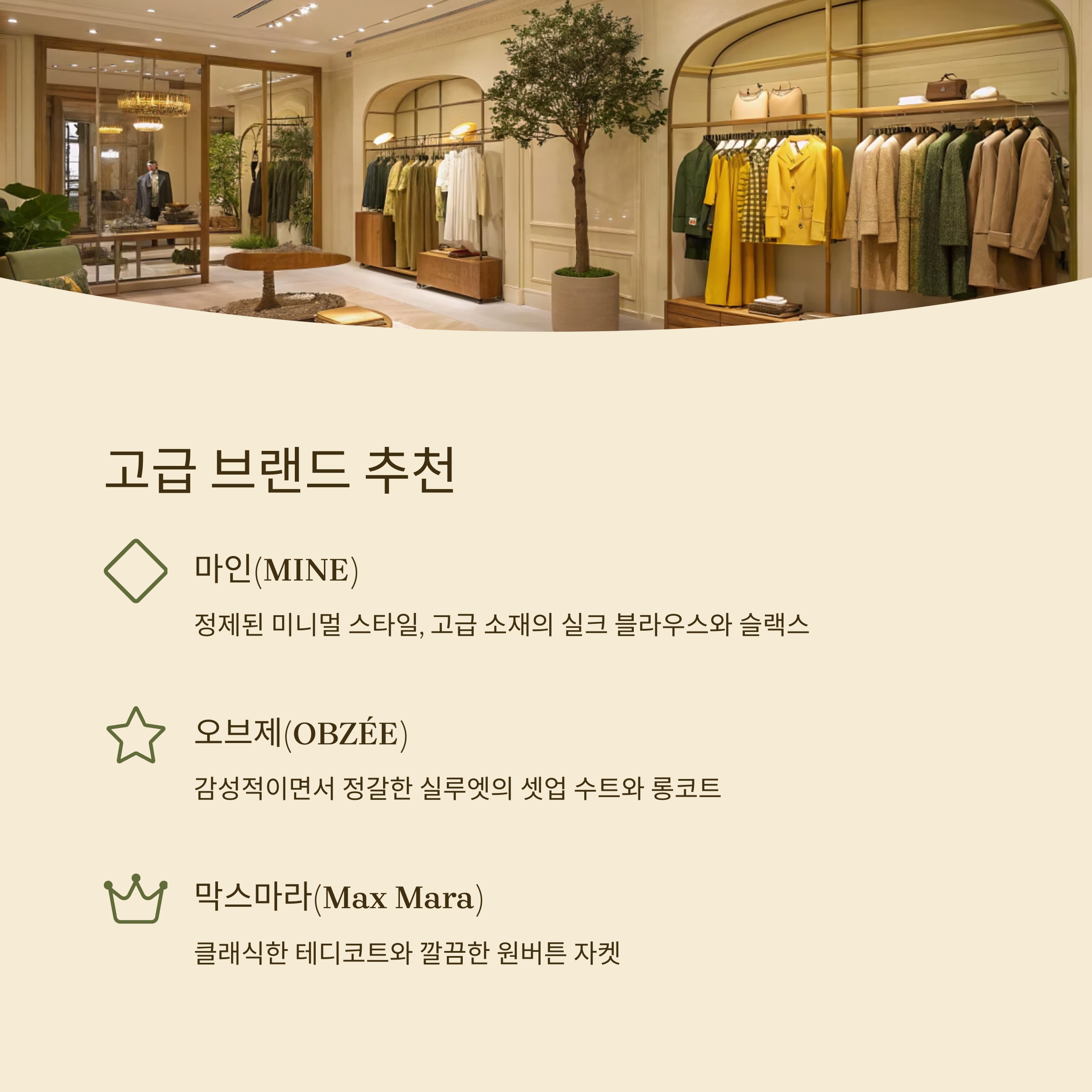 | MINE | 미니멀, 고급 소재 | 실크 블라우스, 슬랙스 | 중고가 |