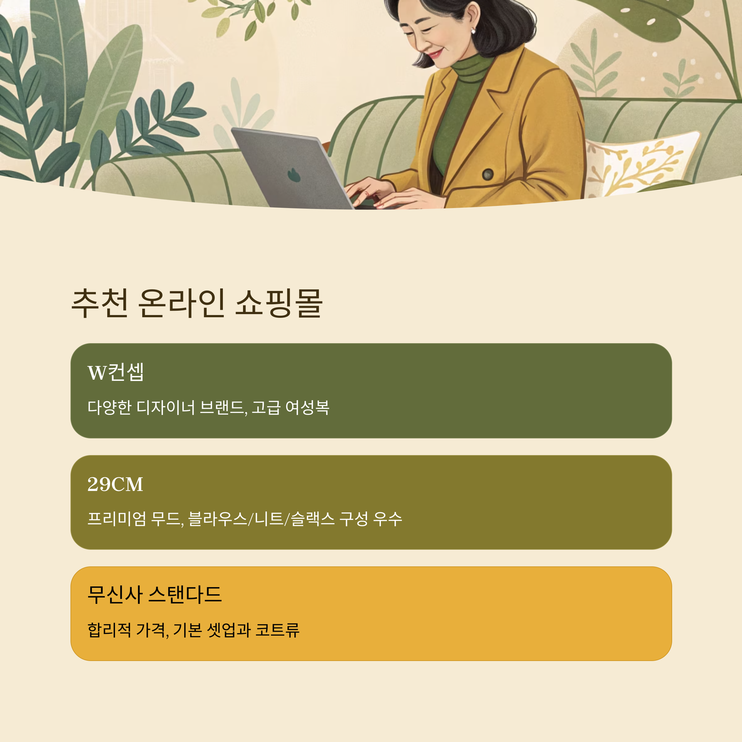 2. **29CM** – 프리미엄 무드를 원하는 40대 여성분들에게 추천해요. 페이지 구성이 깔끔하고 브랜드별 스타일 제안이 잘 되어 있어요. 특히 블라우스, 니트, 슬랙스 카테고리는 매 시즌 실속 아이템이 잘 구성돼 있어요.