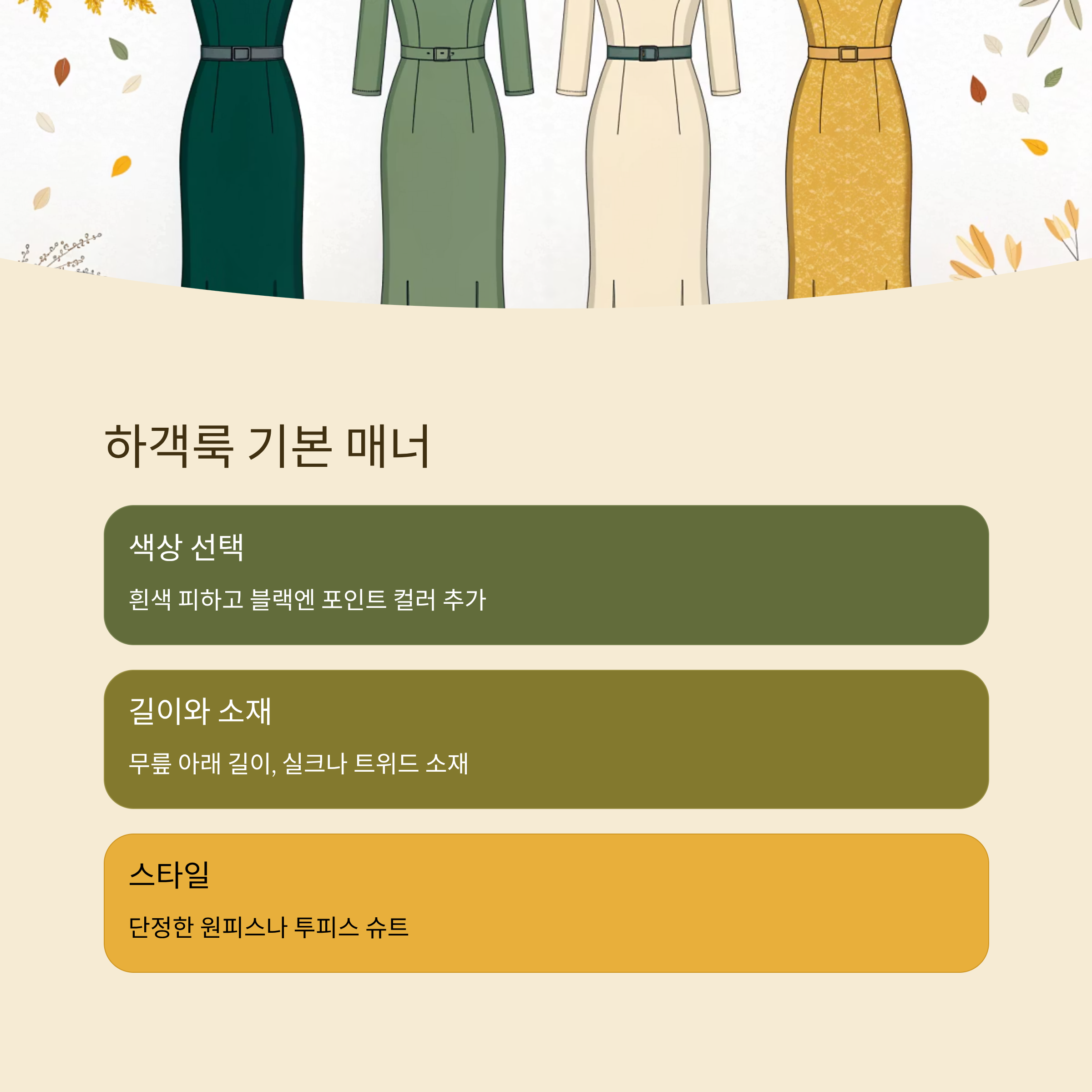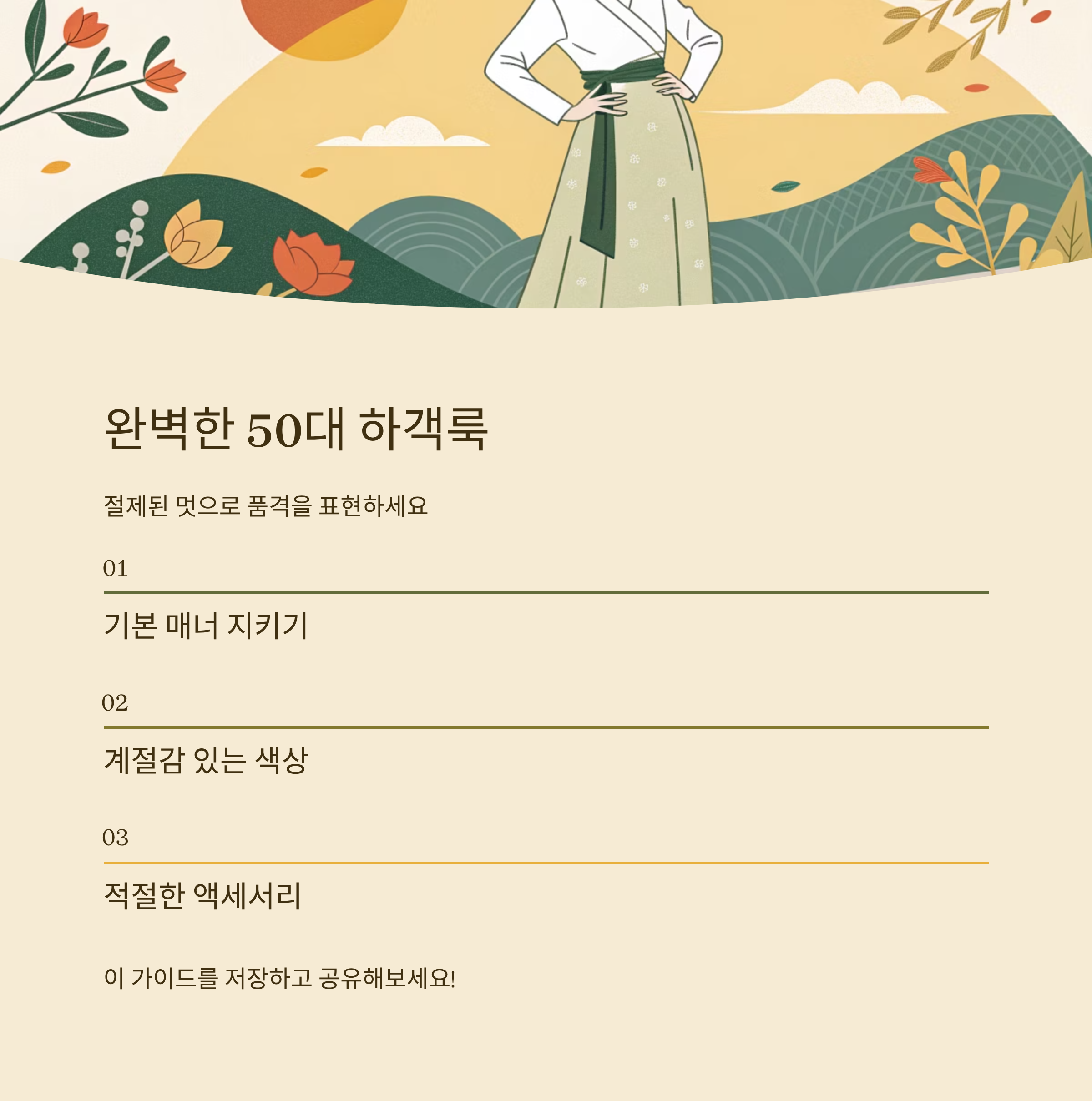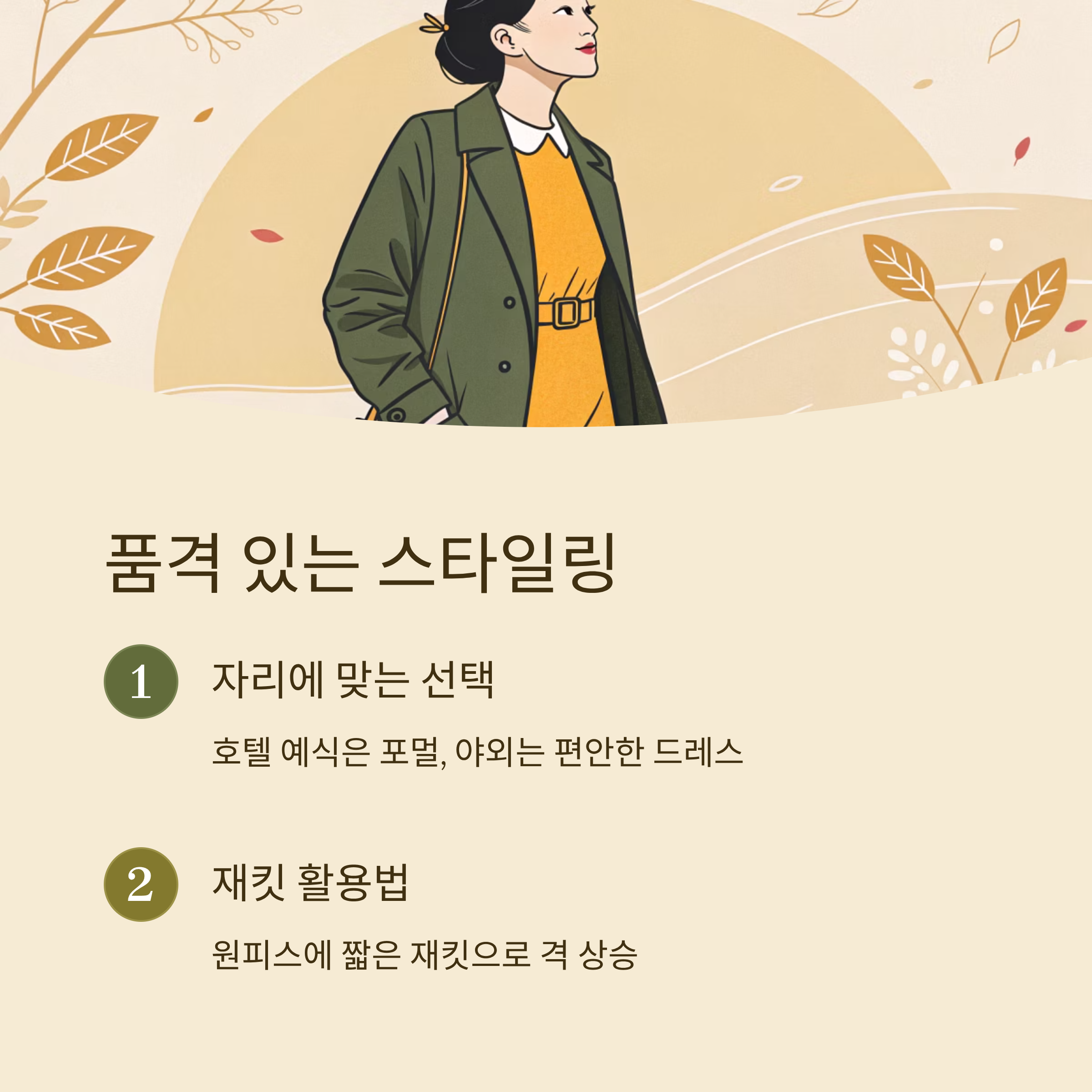제가 생각했을 때 50대 하객룩의 핵심은 ‘절제된 멋’이에요. 과한 장식은 부담스럽고 너무 수수하면 격식에 맞지 않죠. 그래서 실용적이면서도 격식을 지킨 스타일링 팁을 하나씩 알려드릴게요.