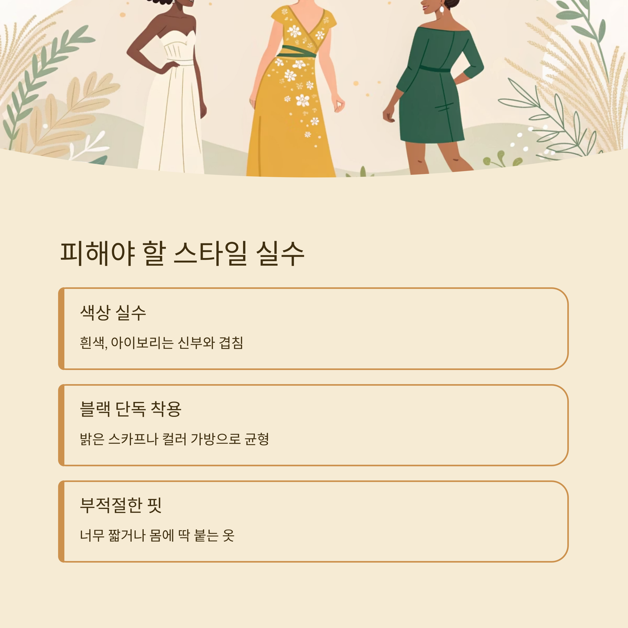 흰색이나 아이보리 계열 옷은 주인공인 신부와 겹칠 수 있으니 피해야 해요. 또한 블랙 원피스를 단독으로 입는 것도 차가운 인상을 줄 수 있어요. 이럴 땐 밝은 스카프나 컬러 가방으로 균형을 맞추는 게 좋아요.