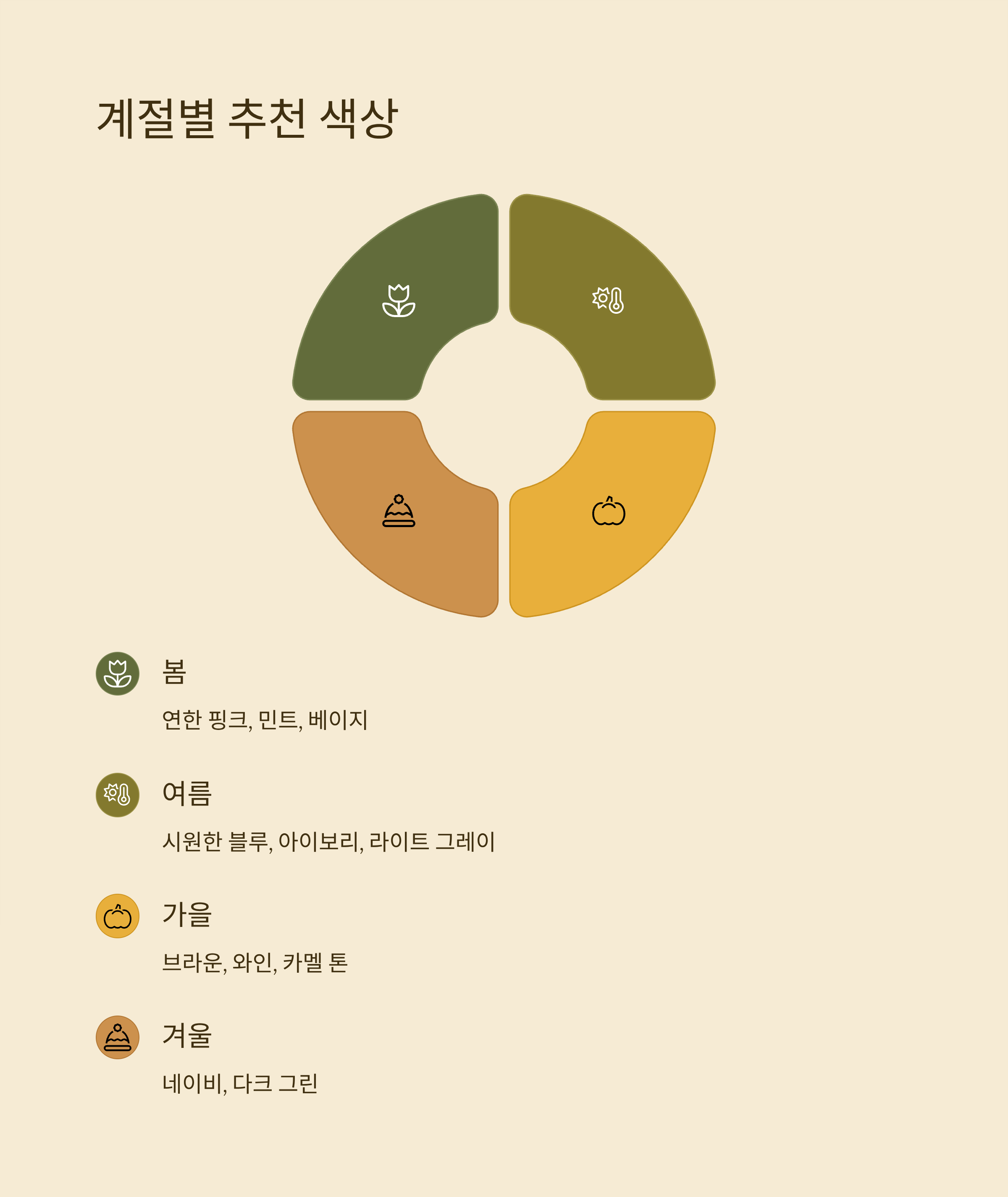 가을에는 브라운, 와인, 카멜 톤이 잘 어울리며, 겨울에는 네이비, 다크 그린 같은 짙은 컬러가 고급스러워요. 계절감에 맞는 색을 고르면 사진에도 잘 나오고 전체 분위기와 자연스럽게 조화돼요.