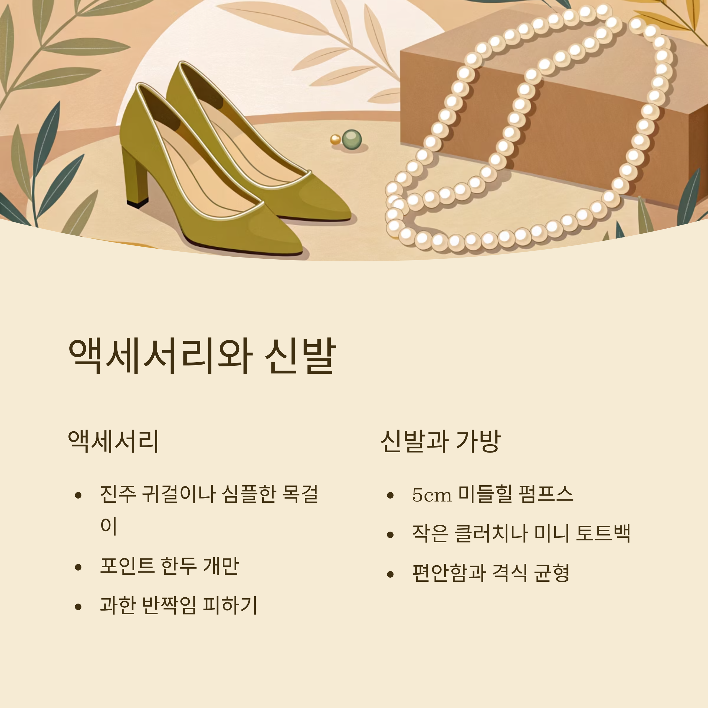 신발은 5cm 정도의 미들힐이나 편안한 펌프스가 적당해요. 너무 높은 하이힐은 불편하고, 플랫슈즈는 격식을 떨어뜨릴 수 있답니다. 가방은 작은 클러치나 미니 토트백이 가장 무난해요.