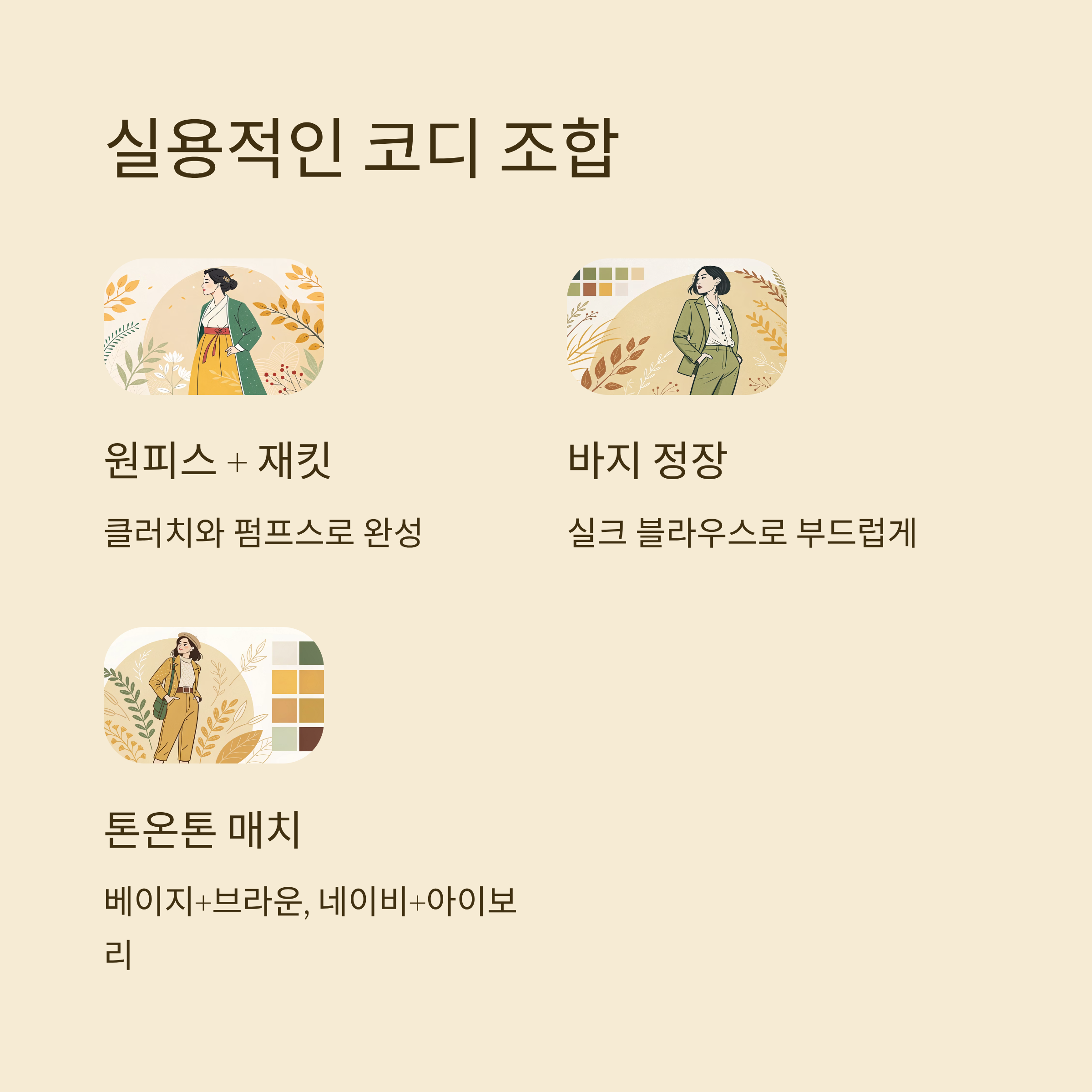 색상은 톤온톤으로 맞추는 게 깔끔해요. 베이지 원피스에 브라운 재킷, 네이비 정장에 아이보리 블라우스 같은 조합은 언제나 안정적이고 세련된 느낌을 준답니다.