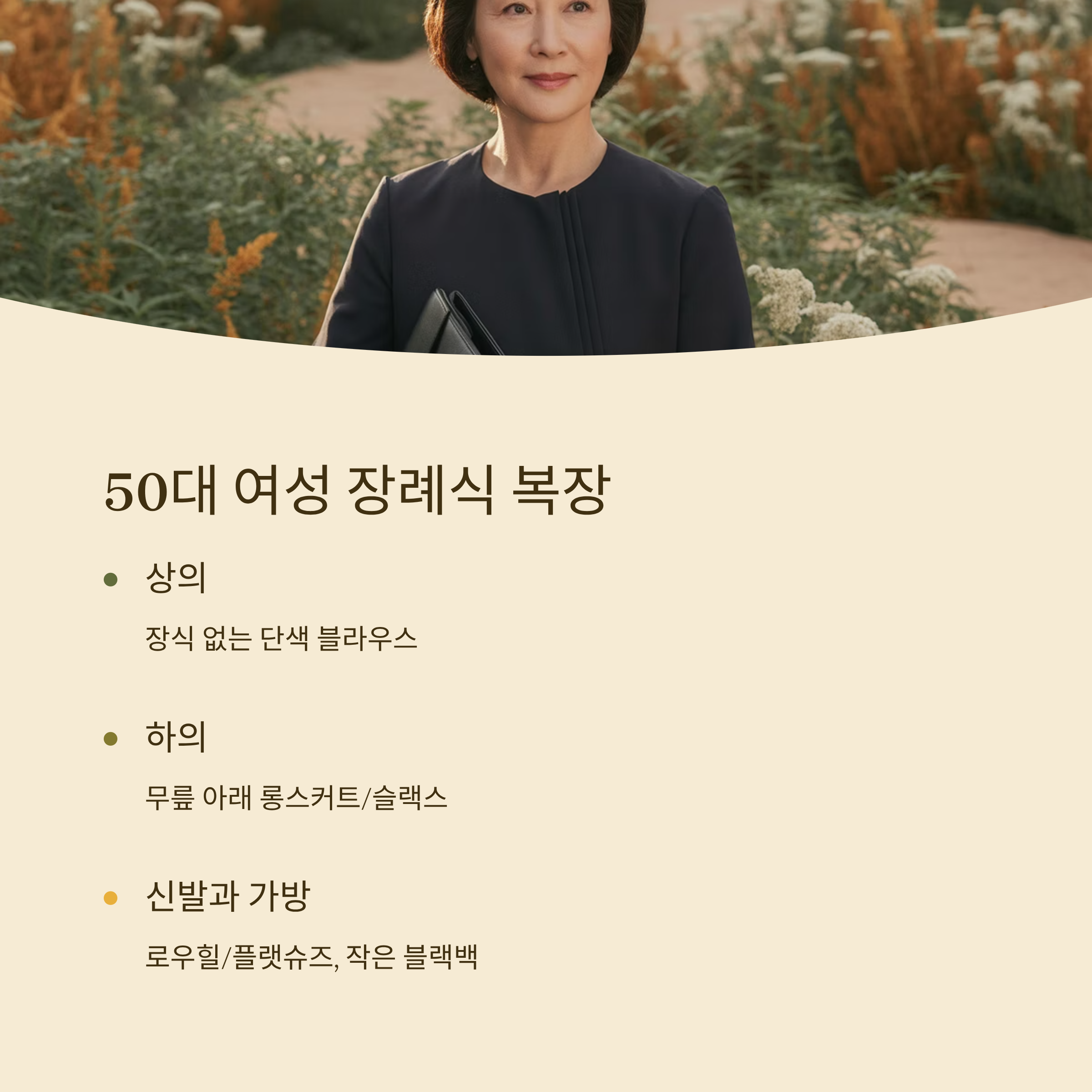 50대 여성은 특히 주변 사람들의 시선을 받기 쉬운 위치에 있기 때문에, 단정함과 격식을 갖춘 모습이 장례식 전체 분위기를 좌우하기도 해요. 너무 튀지 않으면서도 본인의 품위를 살릴 수 있는 조용한 옷차림이 가장 좋아요.