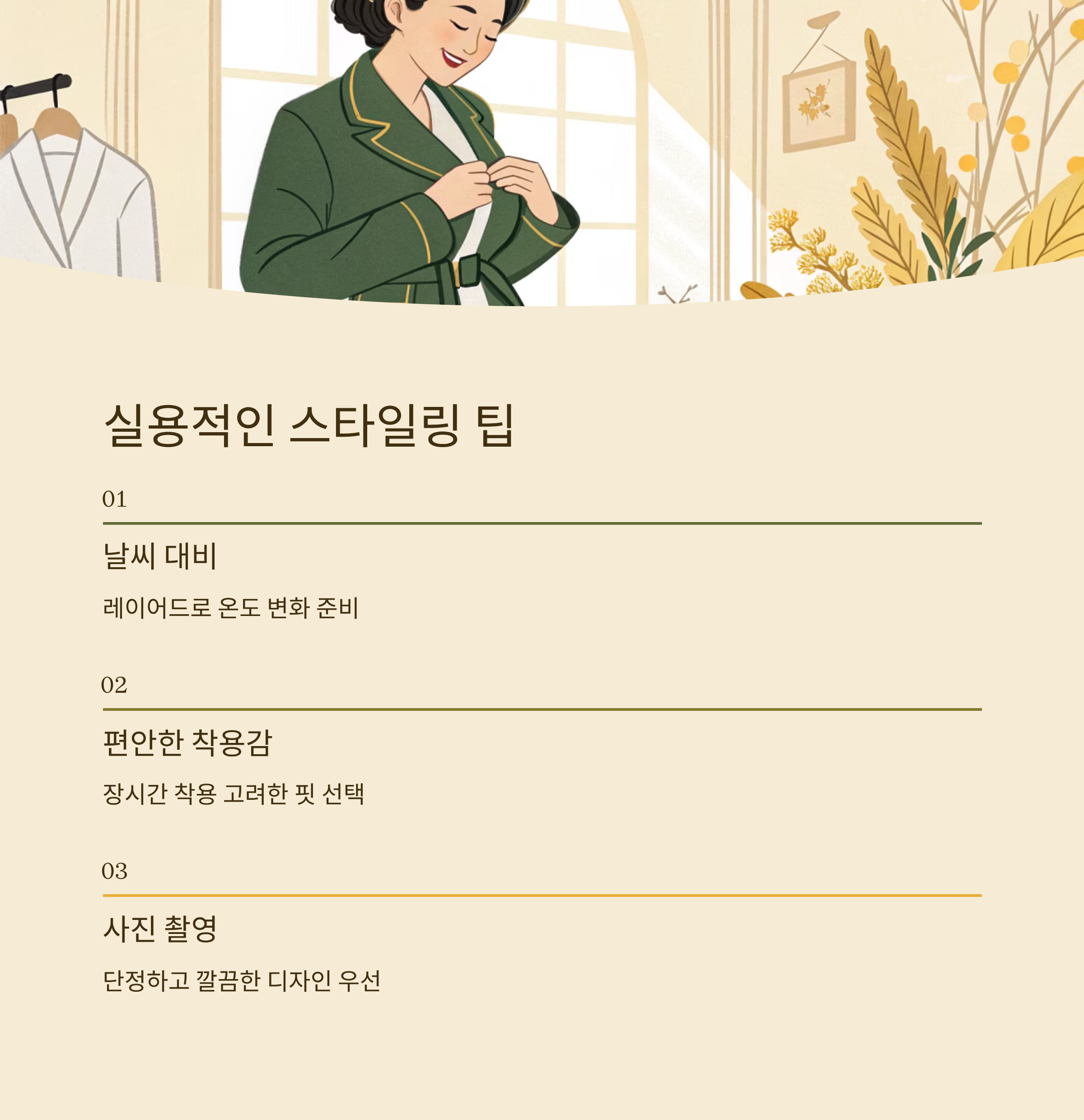 첫째 날씨 변화를 고려해서 레이어드를 준비하는 게 좋아요. 낮에는 가볍게 입고 저녁엔 자켓이나 숄을 걸칠 수 있도록 준비하면 좋아요. 둘째 장시간 착용할 수 있도록 편안한 착용감을 고려해야 해요. 셀프 체크 포인트는 앉았을 때 불편하지 않은지 걸을 때 자연스러운지예요.