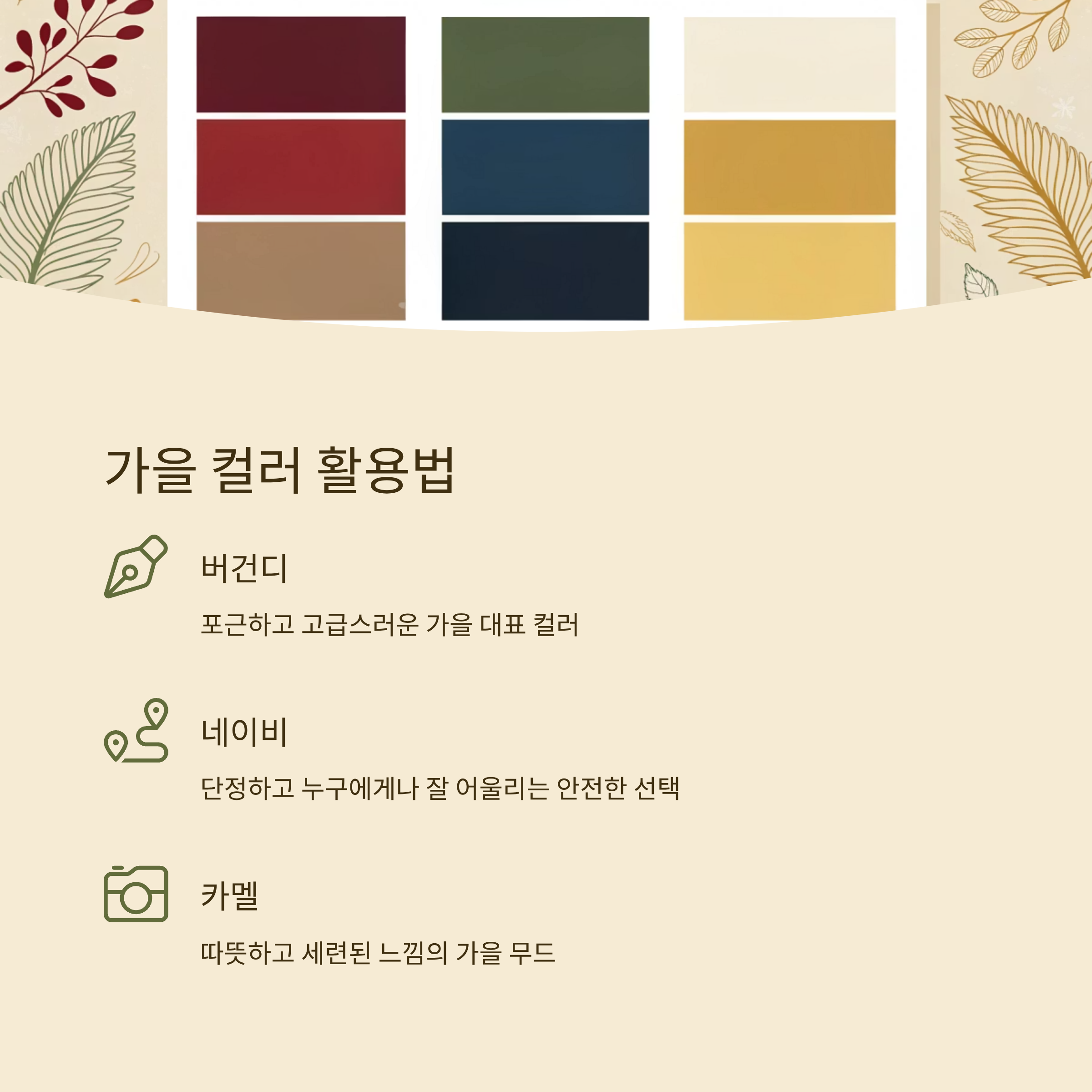 9월말 하객룩에선 톤다운된 컬러가 돋보여요. 버건디나 카멜 컬러는 포근하면서도 고급스러워 보이죠. 네이비와 그레이는 단정하고 누구에게나 잘 어울려요. 여성이라면 버건디 원피스에 베이지 자켓을 매치하는 식으로 톤온톤 코디를 하면 우아한 느낌이 강해져요.