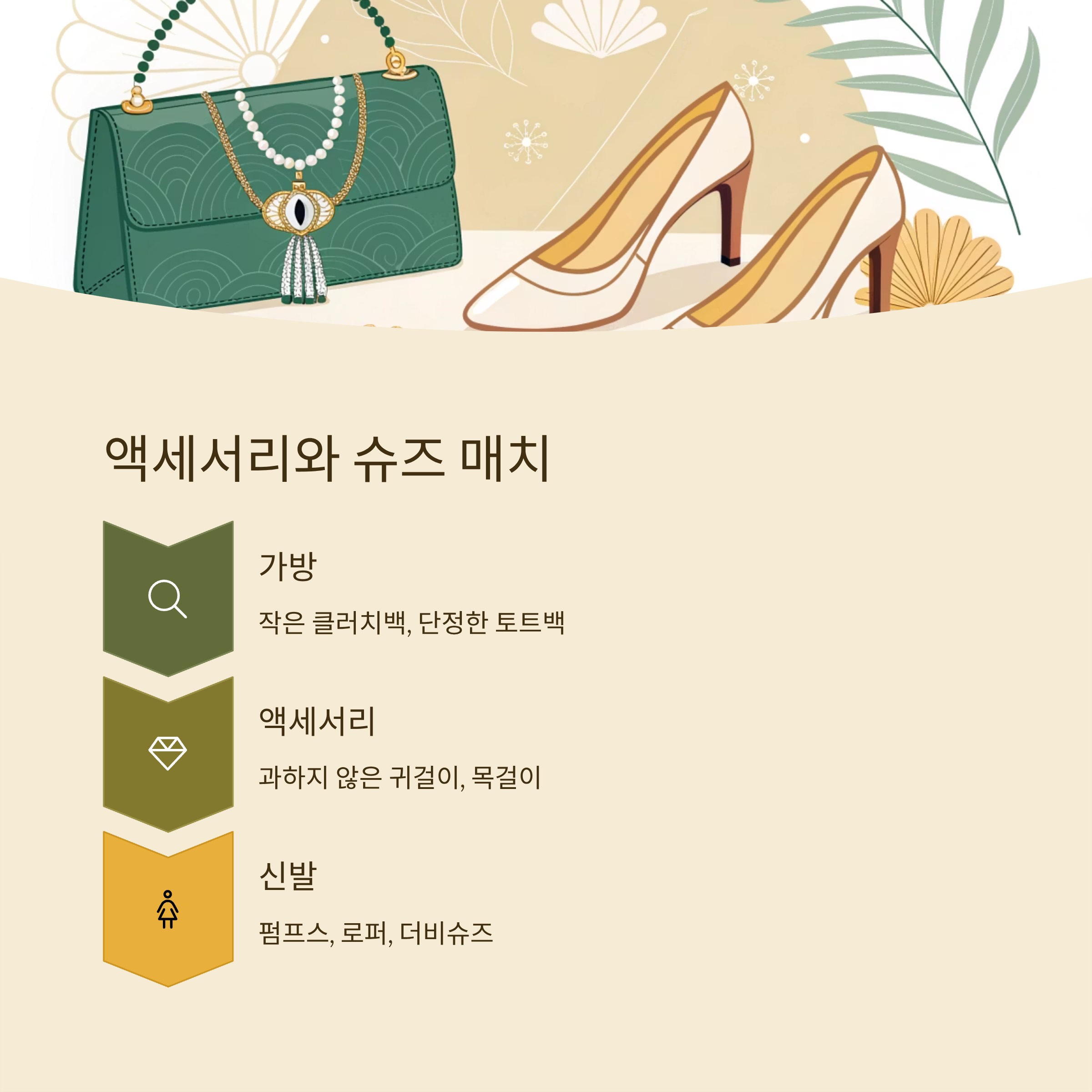 하객룩의 완성은 디테일이에요. 여성은 작은 클러치백이나 단정한 토트백을 선택하면 좋고 귀걸이나 목걸이는 과하지 않게 포인트만 주는 게 좋아요. 신발은 펌프스나 로퍼처럼 안정적이면서도 세련된 아이템이 잘 어울려요.